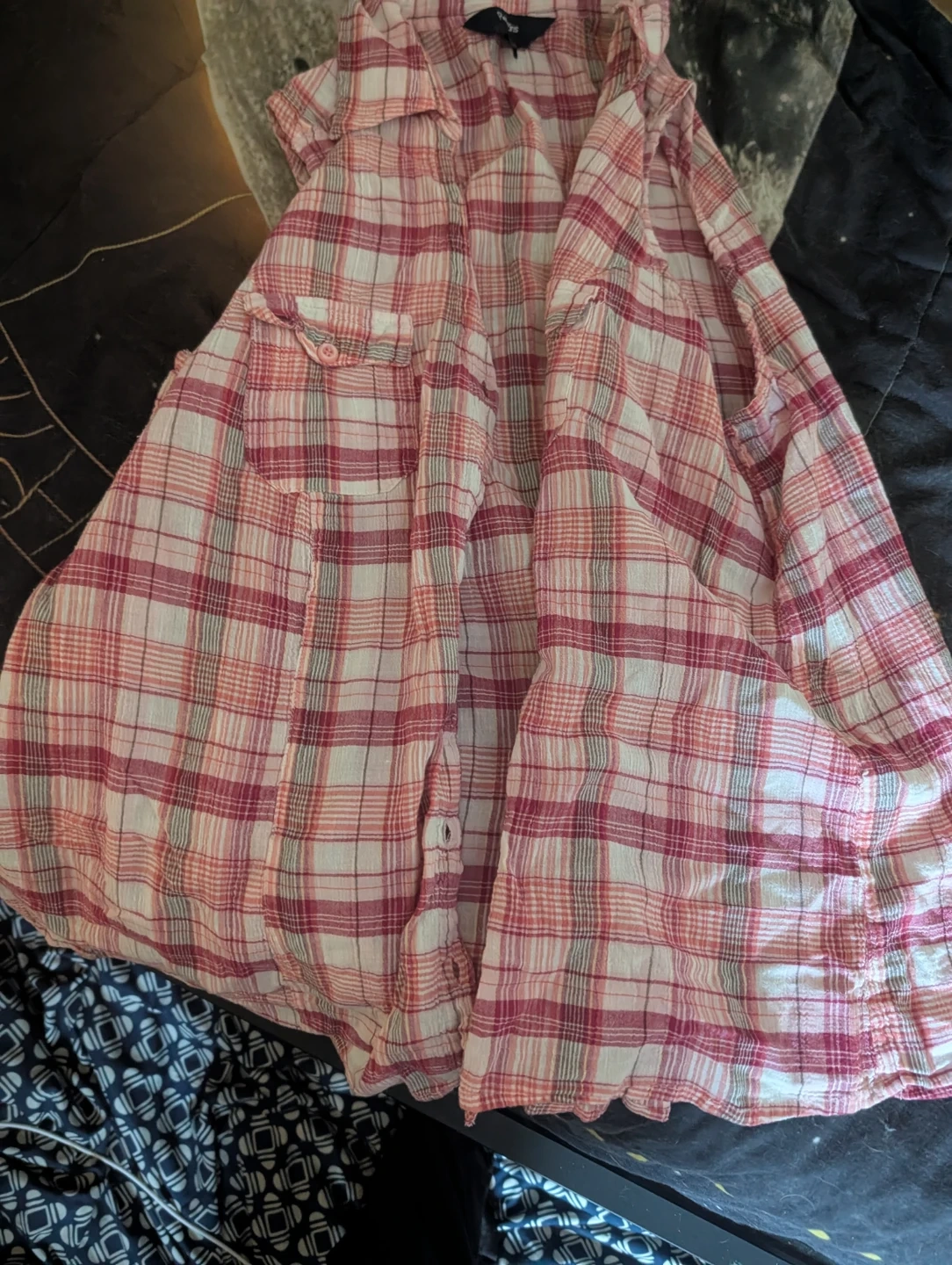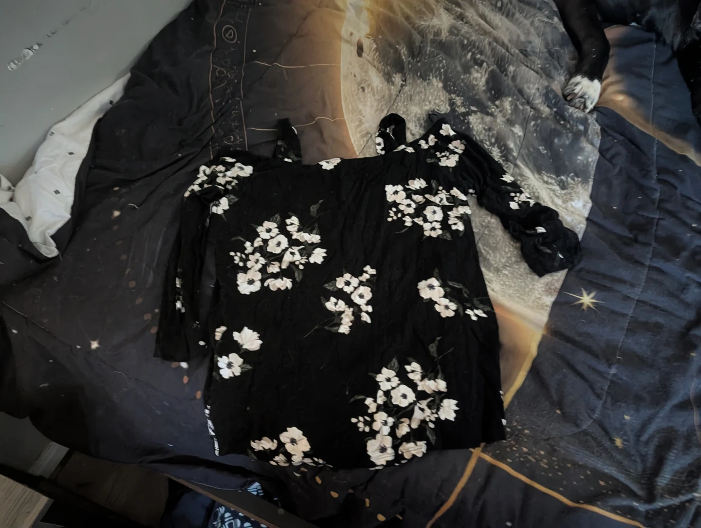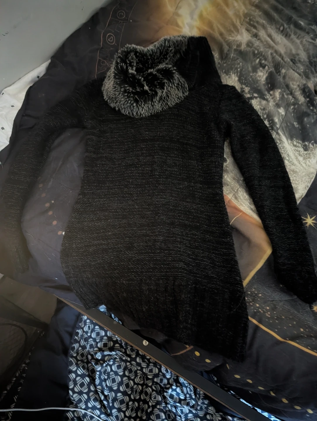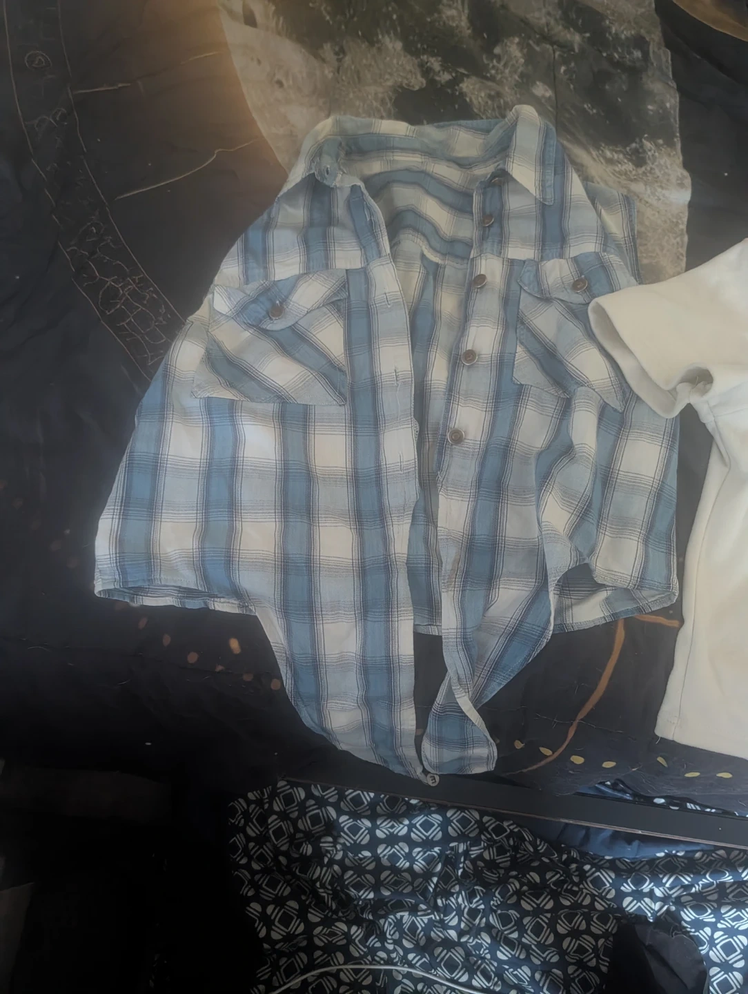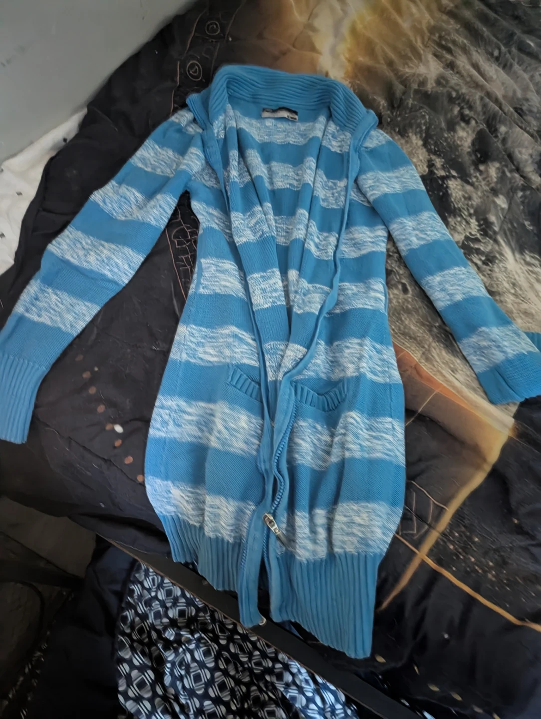 A bundle of women's clothing including a floral print off-the-shoulder top, a plaid collared shirt, a black sweater with a faux fur collar, a light blue button-up cardigan, and a blue and white striped hooded cardigan. Mix and match for various looks!