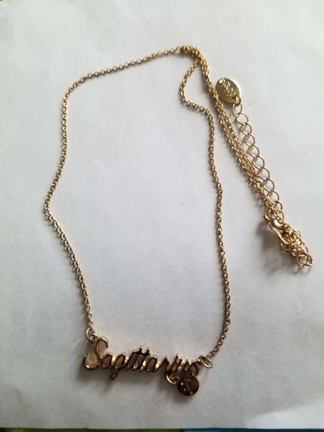 A gold tone necklace with "Sagittarius" written in script. It has an adjustable chain with a small charm at the end. This would make a thoughtful gift for anyone born under the Sagittarius zodiac sign. Brand new