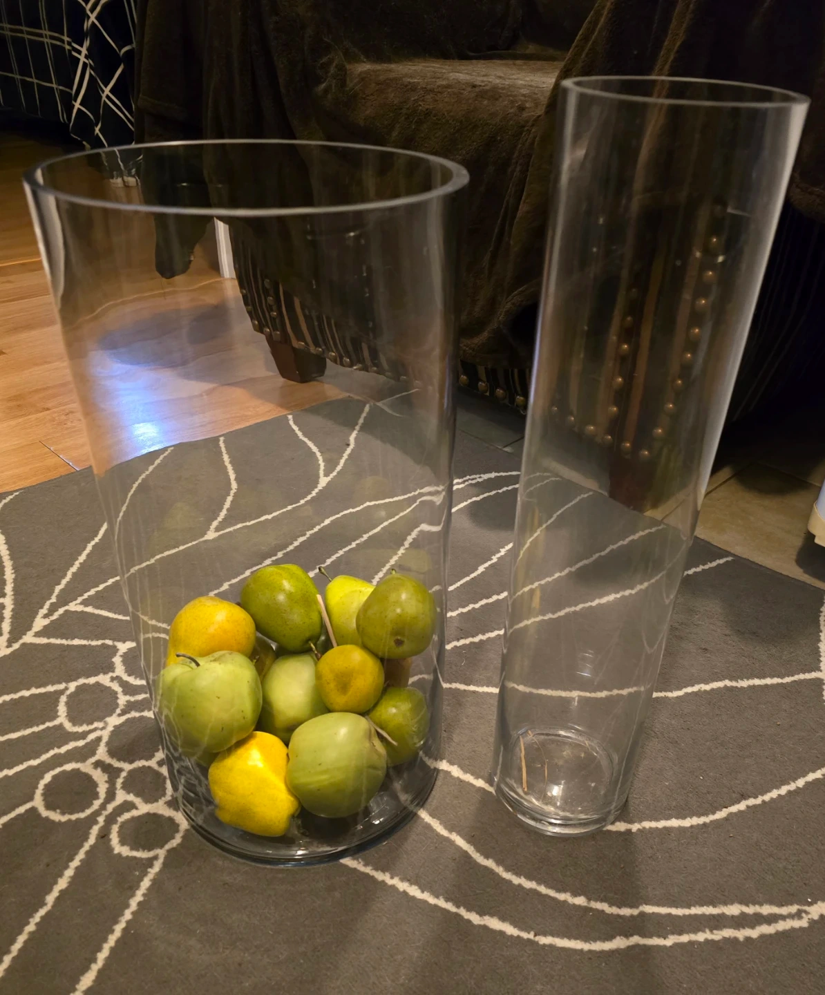 Two clear glass cylinder vases. These vases are made of glass. They're suitable for floral arrangements or decorative displays.