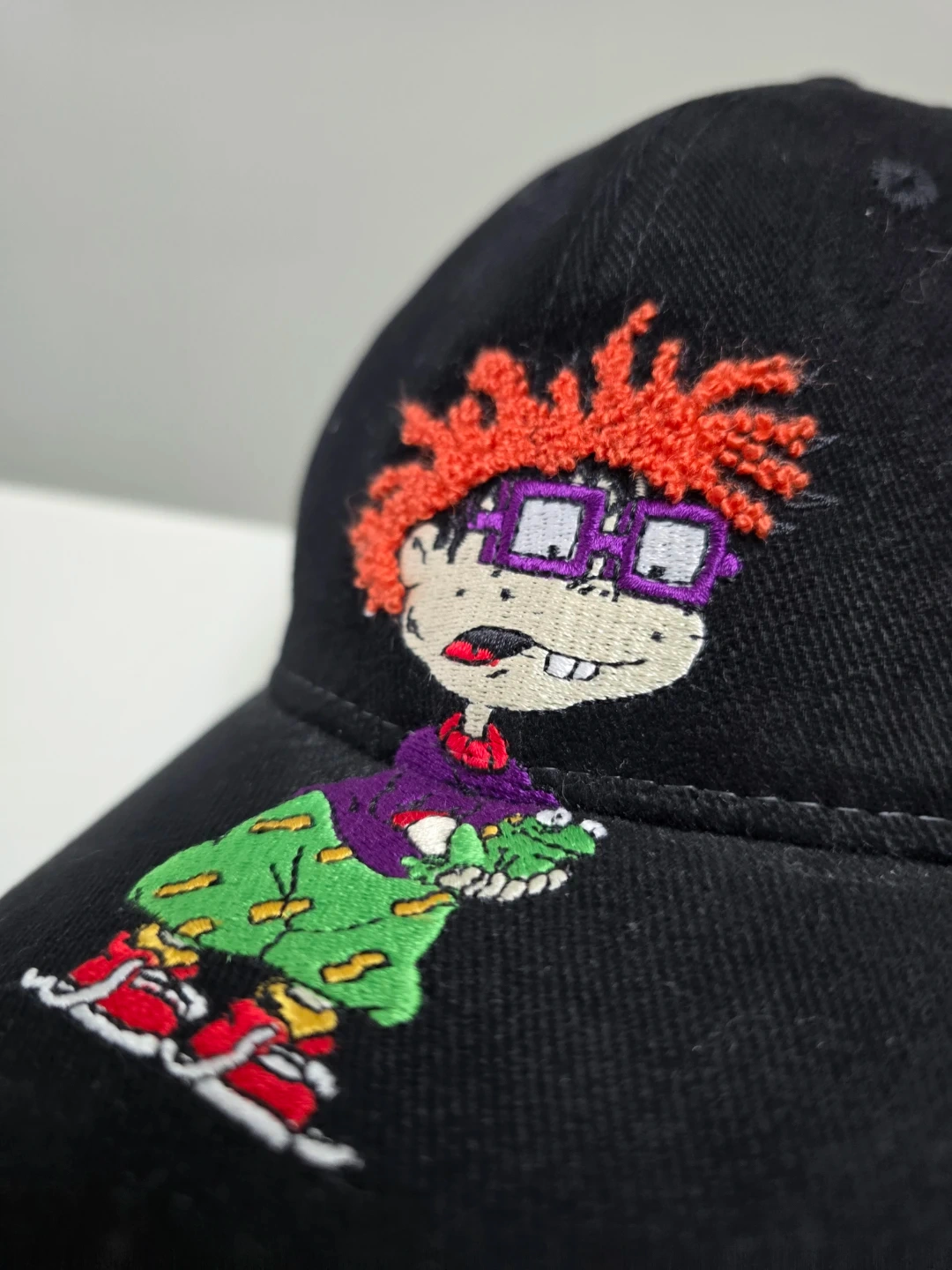 This black baseball cap features an embroidered Chucky from Rugrats. It's made of 100% cotton and is one size fits all.