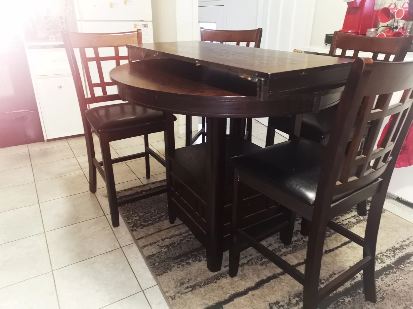 This counter height dining set features a dark wood finish with four upholstered chairs. The table has a unique tiered design, and the chairs offer comfortable seating. It's a great addition to a kitchen or dining area.