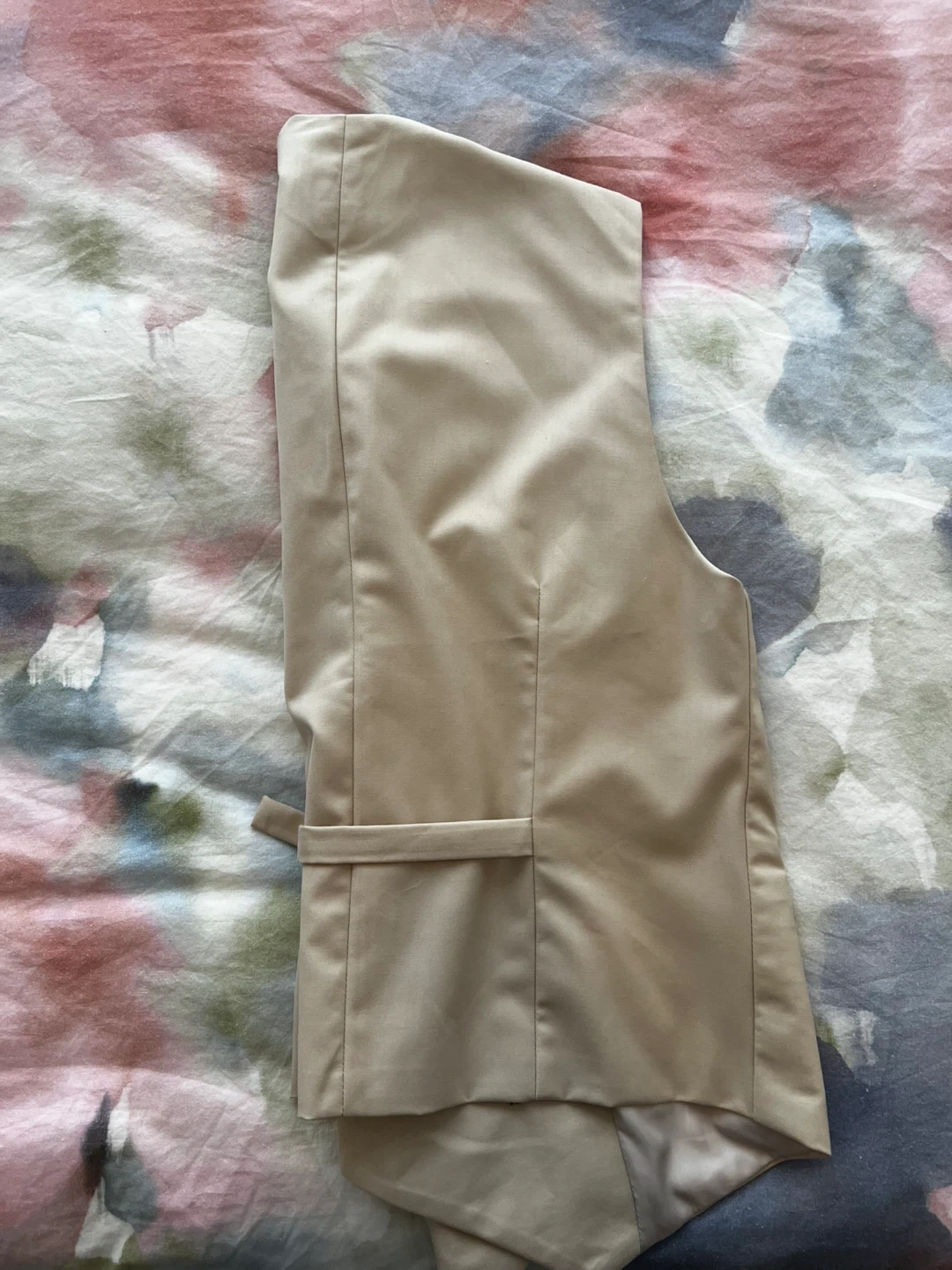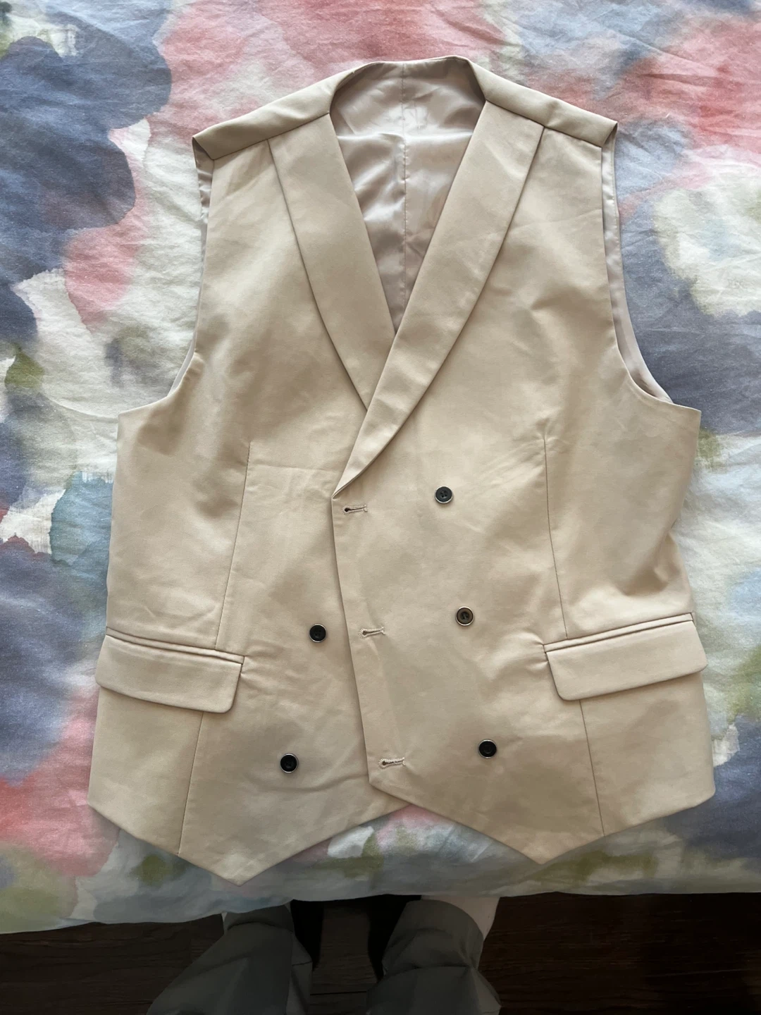 This tan vest features a double-breasted front with black buttons. It has a satin lining and two front pockets. Great for layering your outfit!