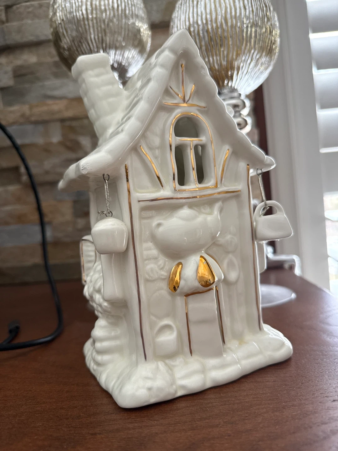 A charming white ceramic decorative house with gold trim accents. It features a quaint design with a chimney and hanging accessories. This piece would add a whimsical touch to any shelf or mantelpiece. It's made of ceramic material.