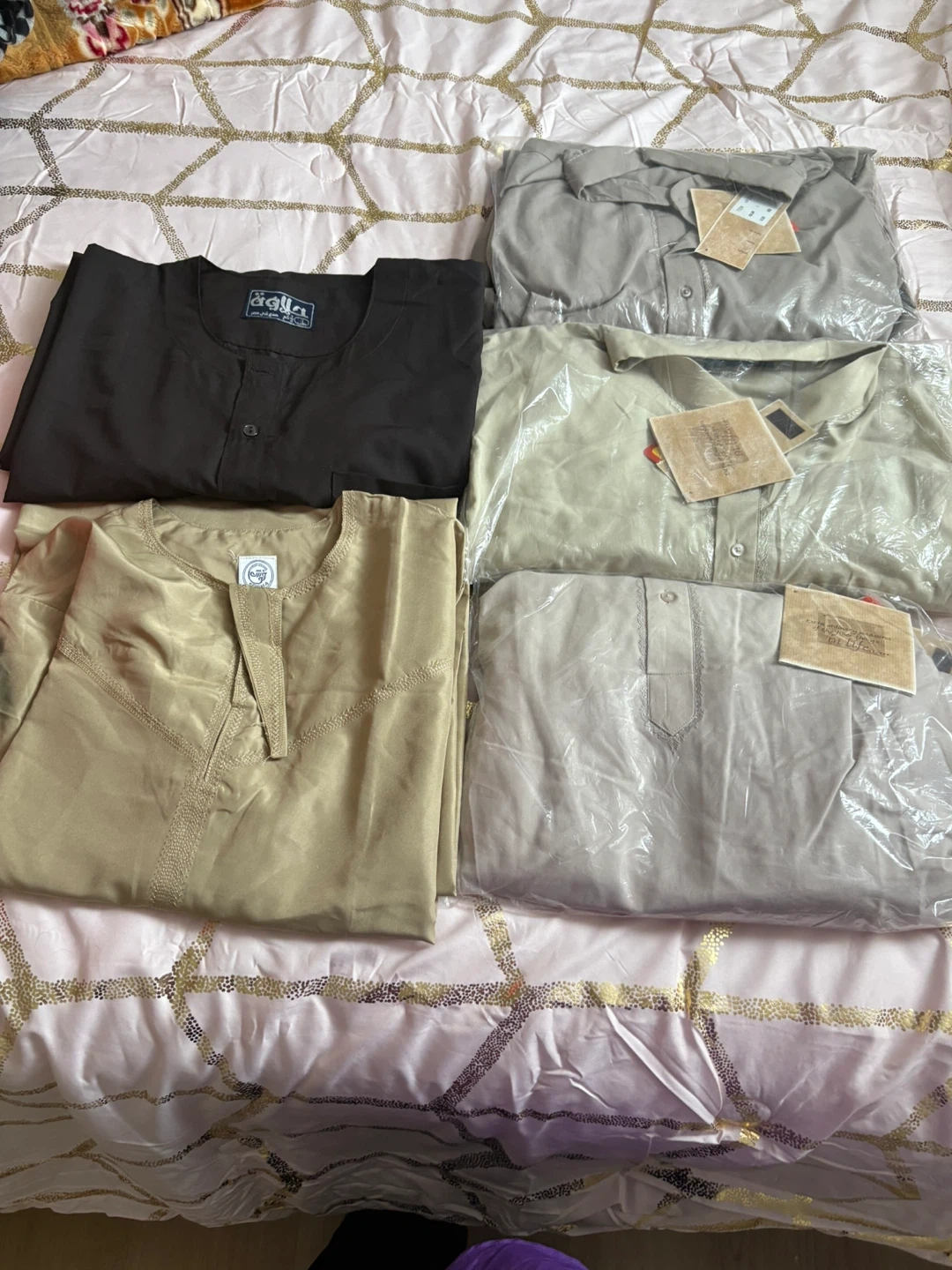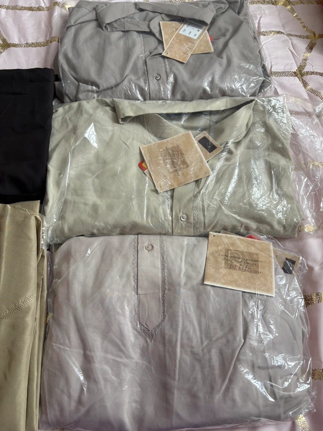 A set of six men's shalwar kameez outfits in various colours. Includes black, light beige, grey, and beige. Each outfit is made of a lightweight fabric and comes with a kameez and shalwar. Perfect for daily wear or special occasions!