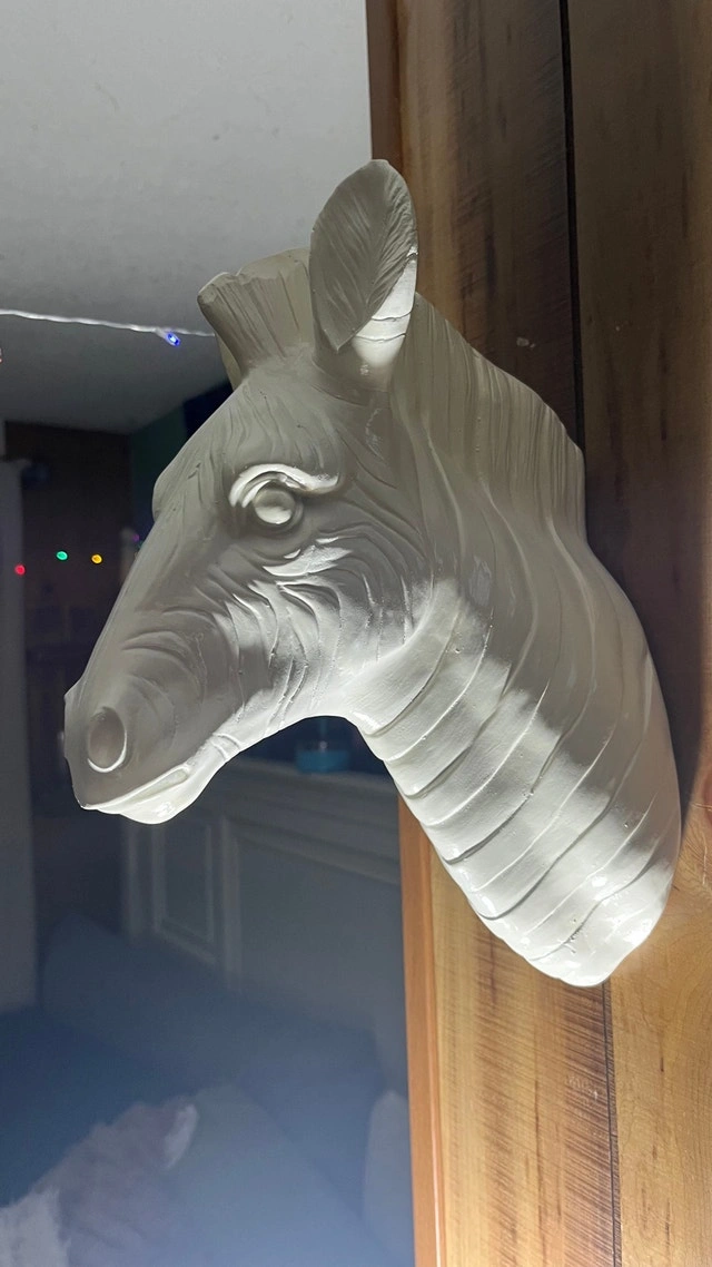 Add a bold, modern touch to your home with this striking white zebra head wall sculpture. Crafted with intricate textures that mimic natural features, this "faux taxidermy" piece offers a sophisticated safari aesthetic without being real. Perfect for a nursery, living room, or as a statement piece in a creative office. Key Features: -Material: High-quality, durable polyresin with a matte white finish. -Style: Modern, minimalist, and cruelty-free faux taxidermy. -Design: Features a detailed 3D texture, including a defined mane and realistic facial contours. -Mounting: Lightweight and easy to hang with a built-in keyhole on the back (mounting hardware not included). Condition: Used - Good. For Sale By: Owner. Cash accepted: Yes.