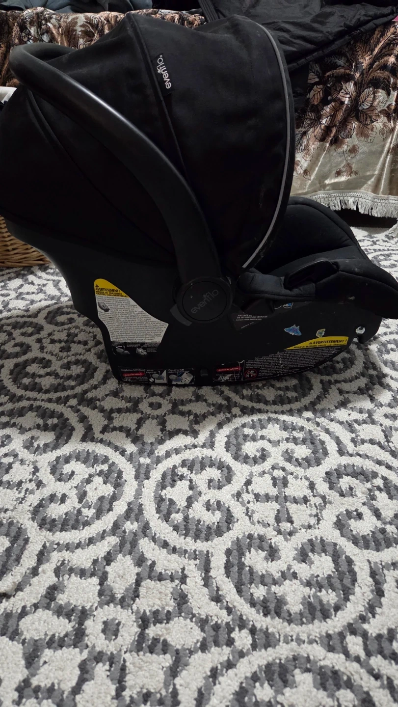 This is a black Evenflo infant car seat. It features a padded interior and a secure harness system for safety. This car seat is designed for infants and is easy to install.