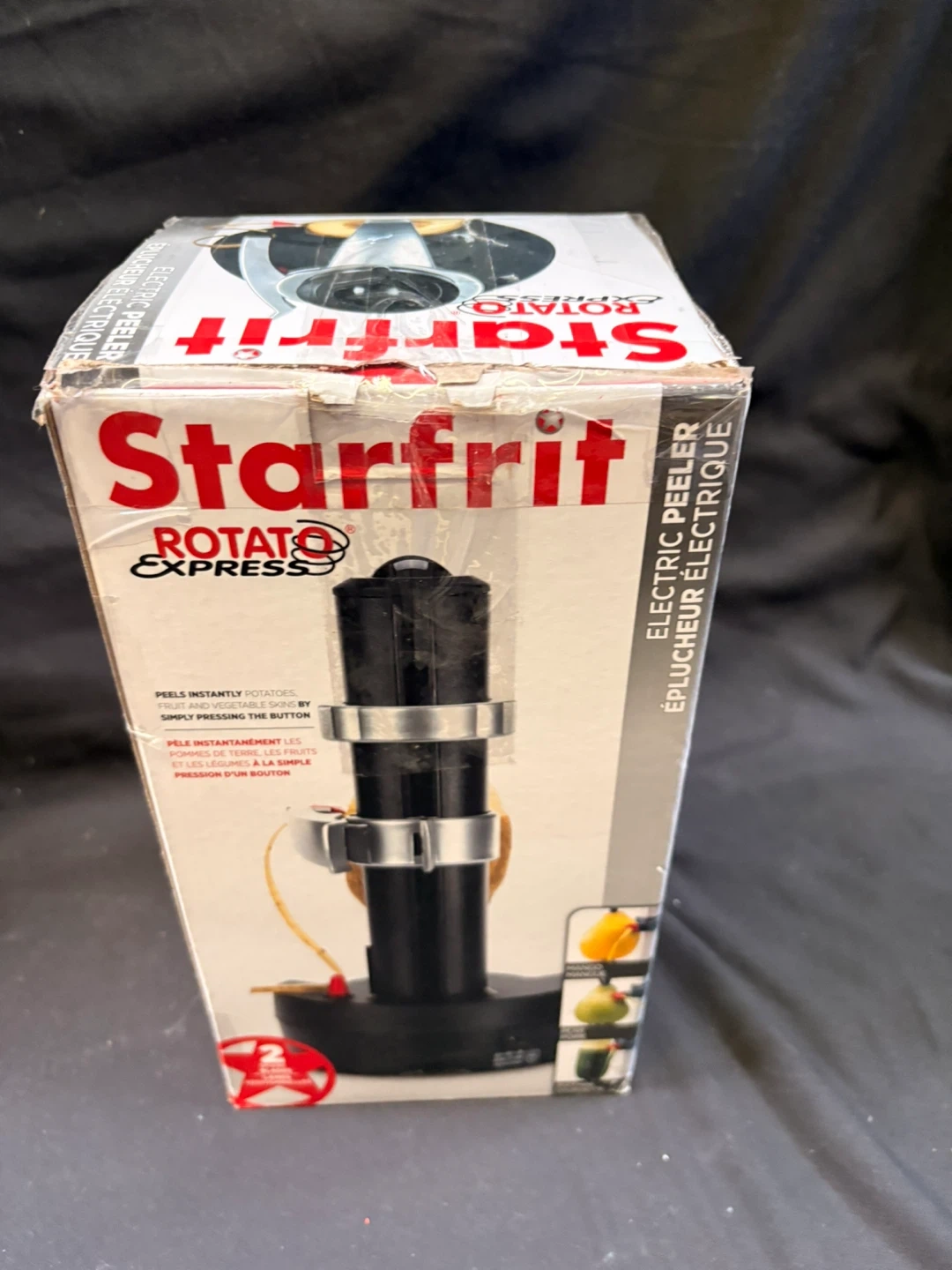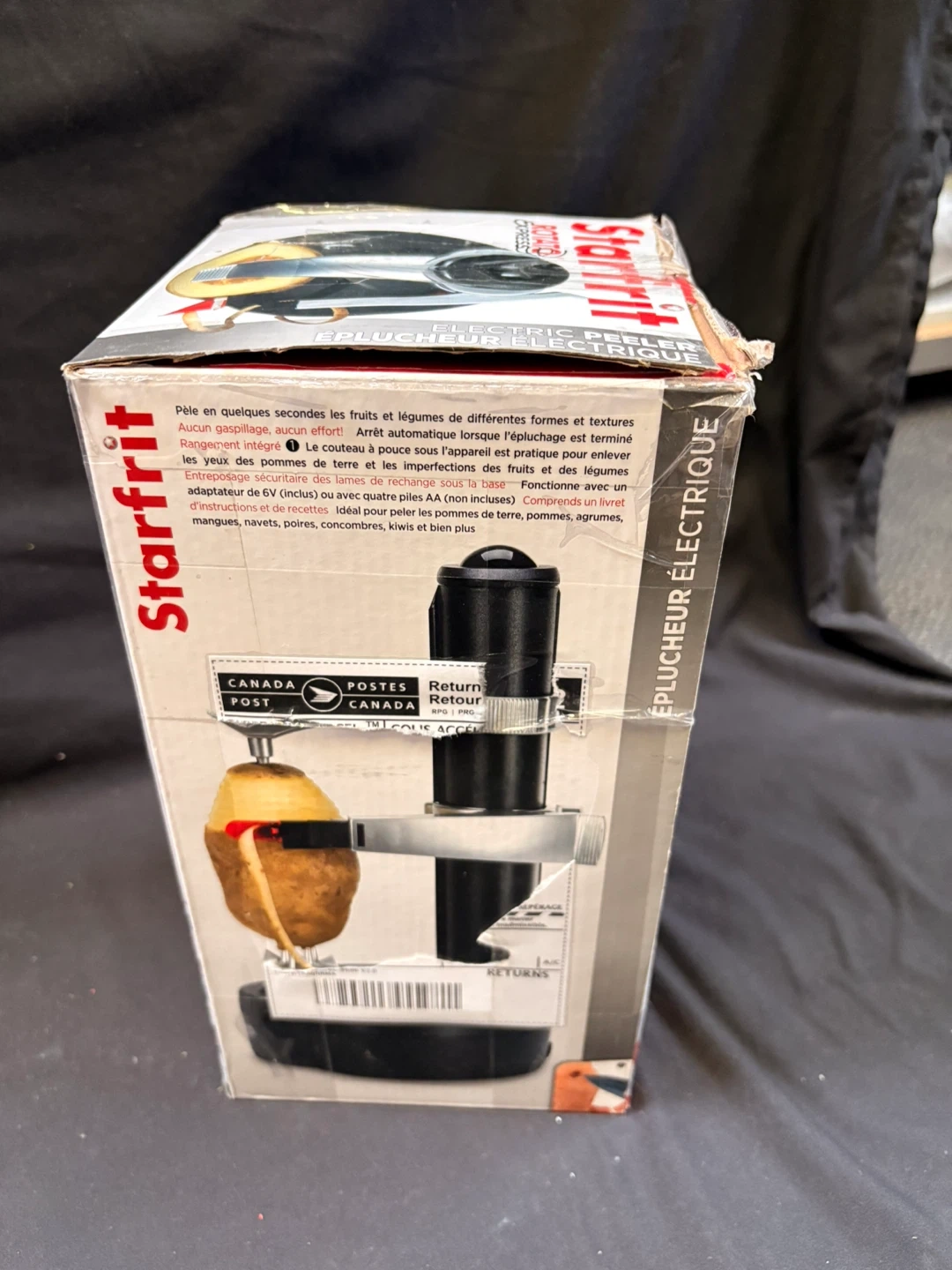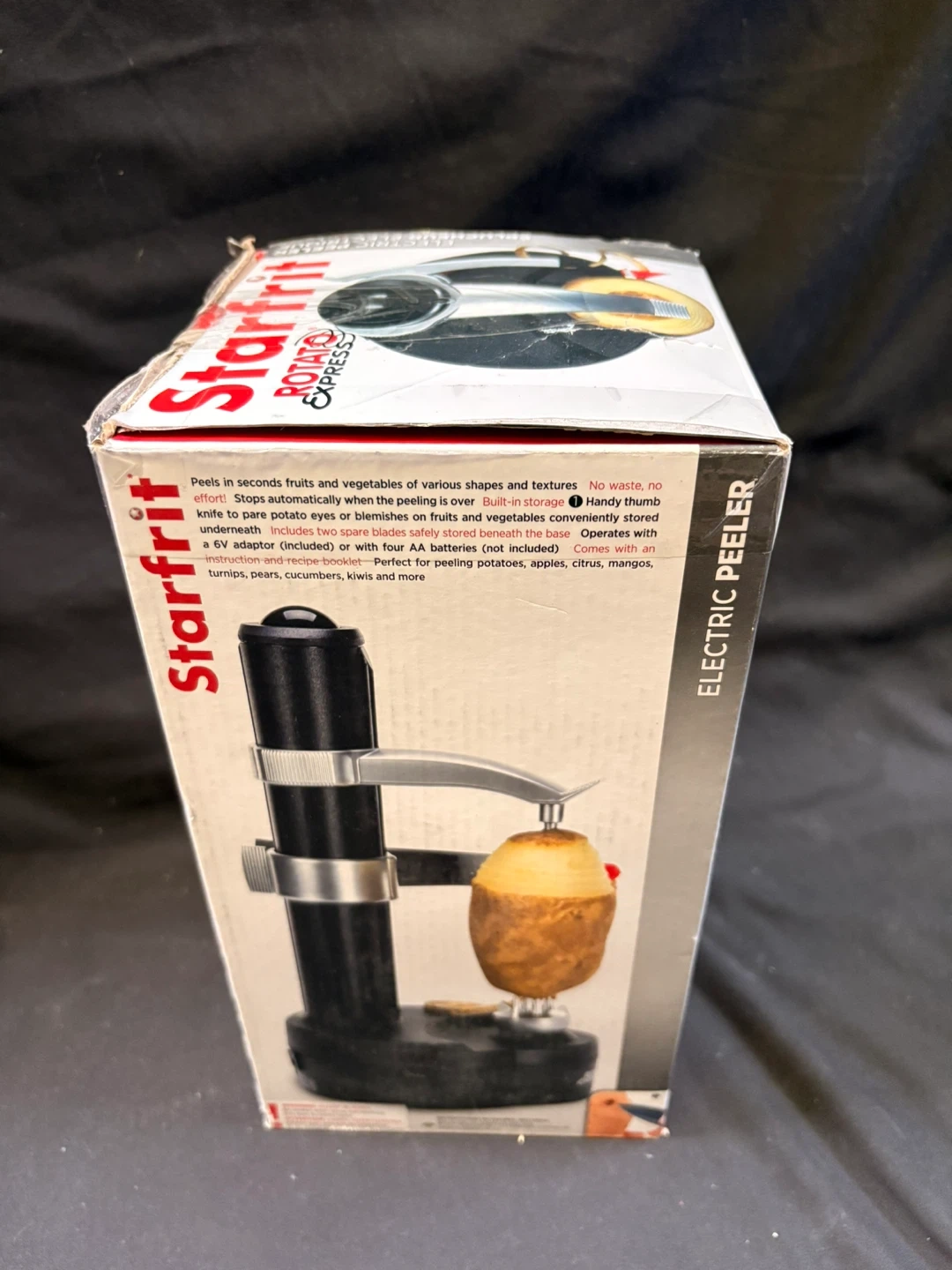 Peels in seconds fruits and vegetables of various shapes and textures. It stops automatically when the motion is complete. Operates with a 6V adaptor or four AA batteries (not included). Perfect for peeling potatoes, apples, citrus, mangos, turnips, pears, cucumbers, kiwis and more!