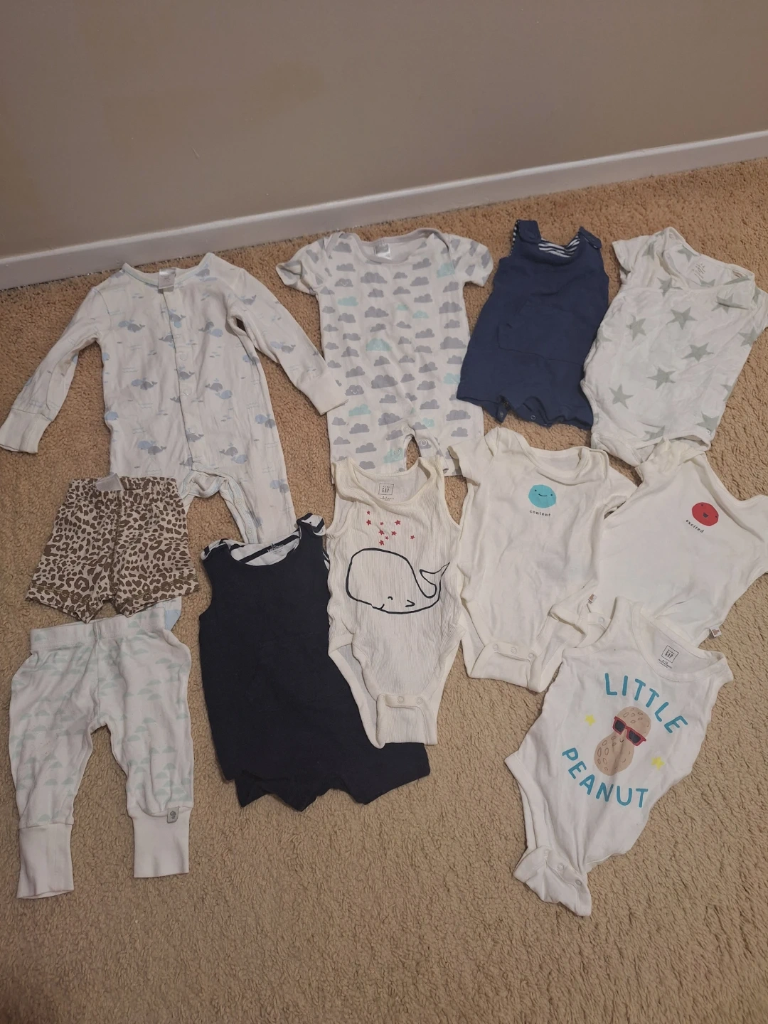 A bundle of used baby clothes including onesies and pants. 7 peices are from Baby Gap, Size 3m to 9m. Cash only, pick up at Donmills & Finch