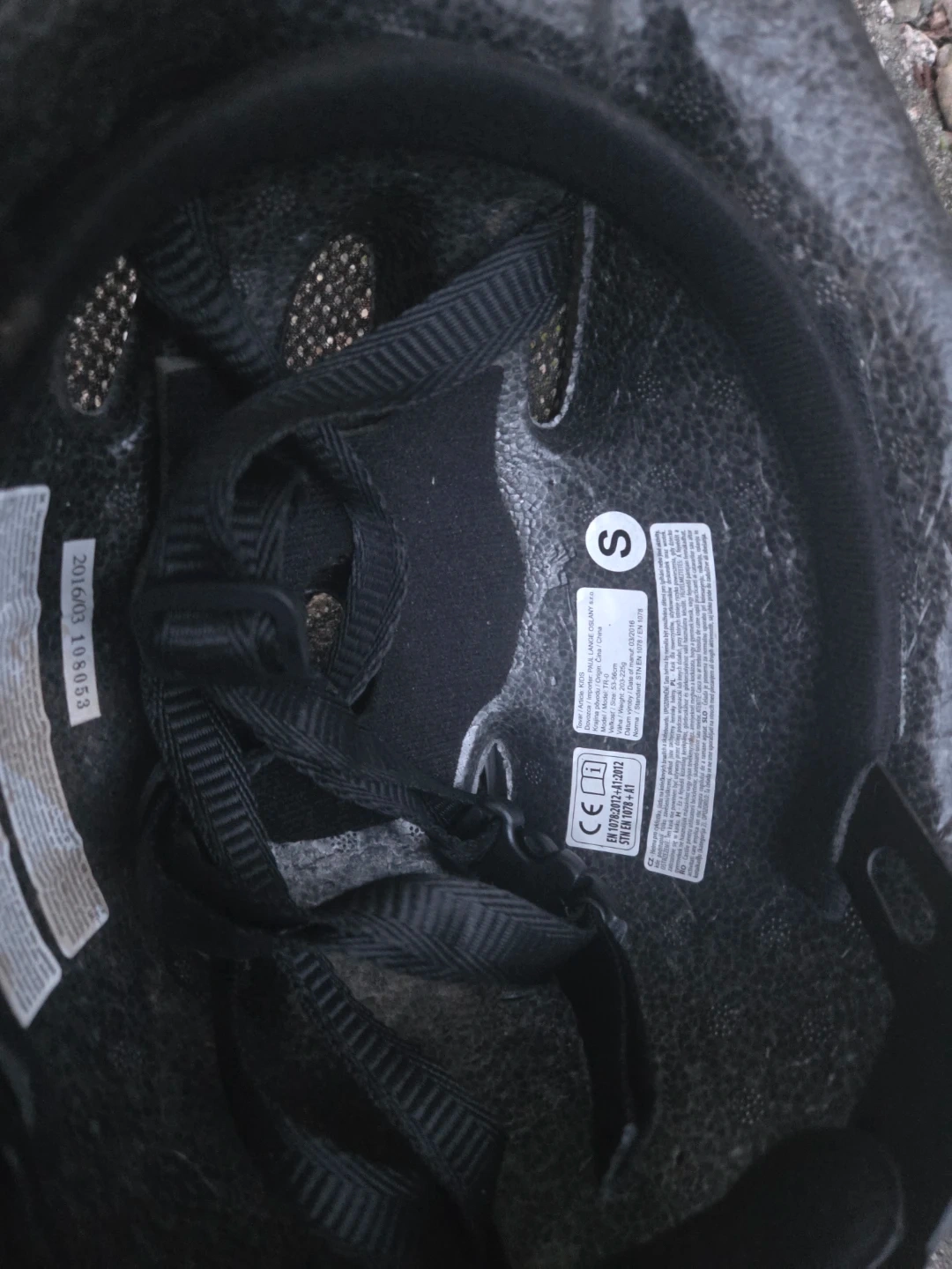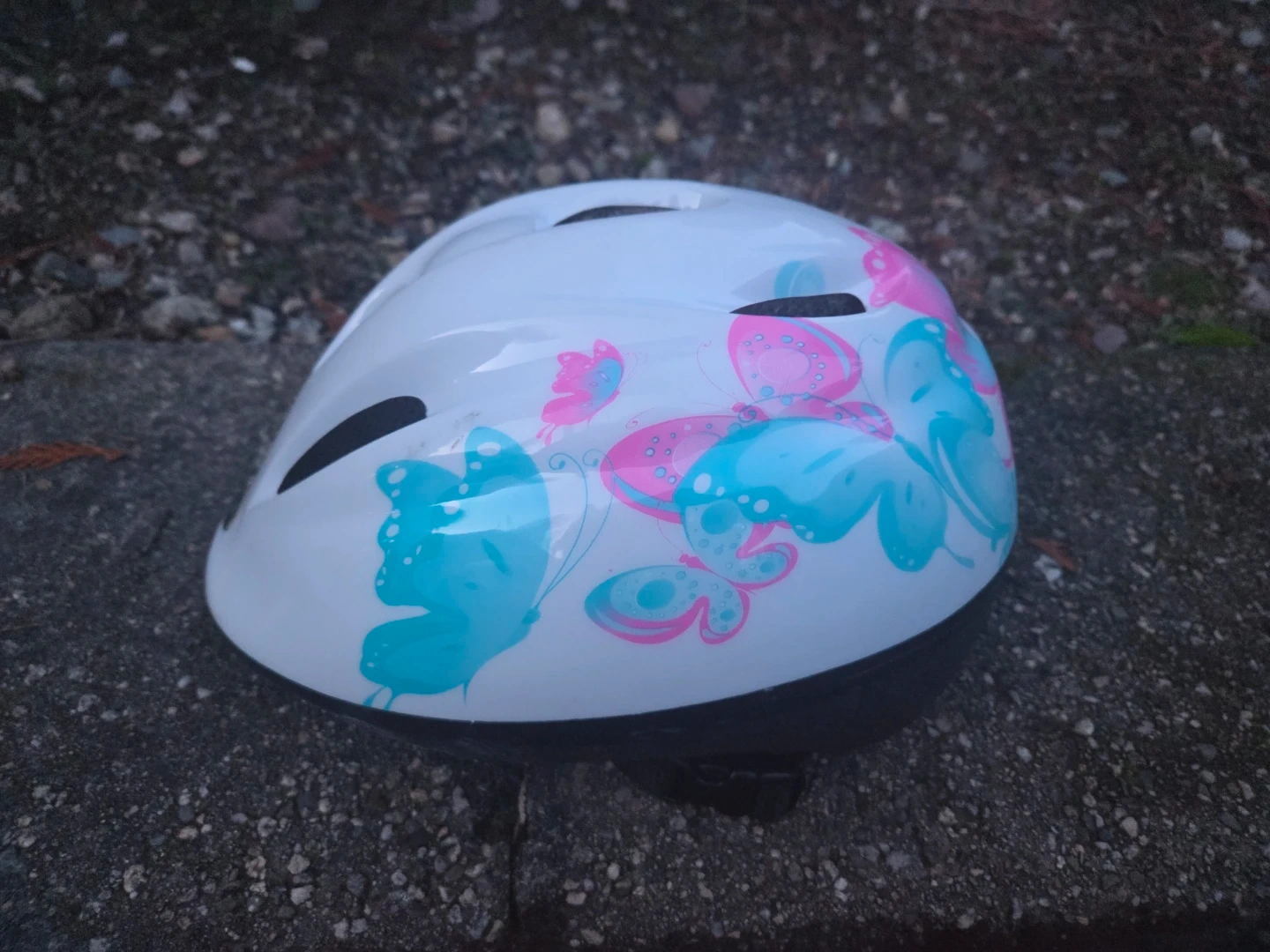 This kids' bike helmet is white with a fun butterfly design in pink and teal. It features adjustable straps for a secure fit and ventilation holes for comfort. Size S indicated inside.