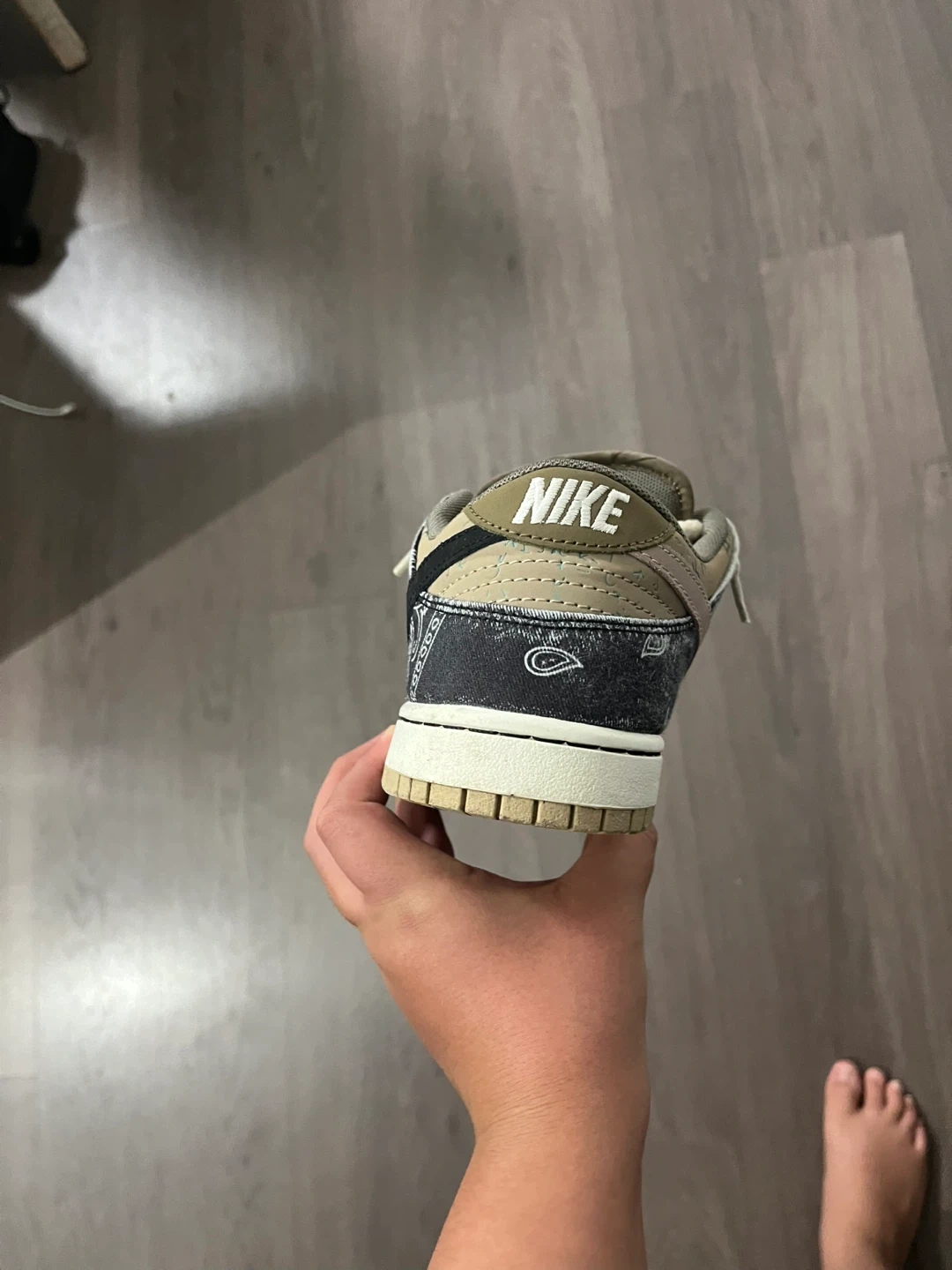 These Nike SB Dunk Low sneakers feature a unique patchwork design with bandana and plaid patterns. They have a distinctive lace-up closure and the iconic Nike Swoosh. The insoles clearly show the Nike SB branding.
