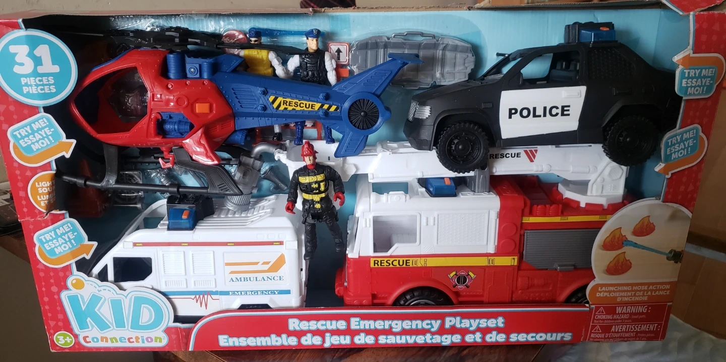 This Kid Connection Rescue Emergency Playset comes with 31 pieces. It includes a police car, ambulance, and helicopter. Features launching hose action! 3 plus
