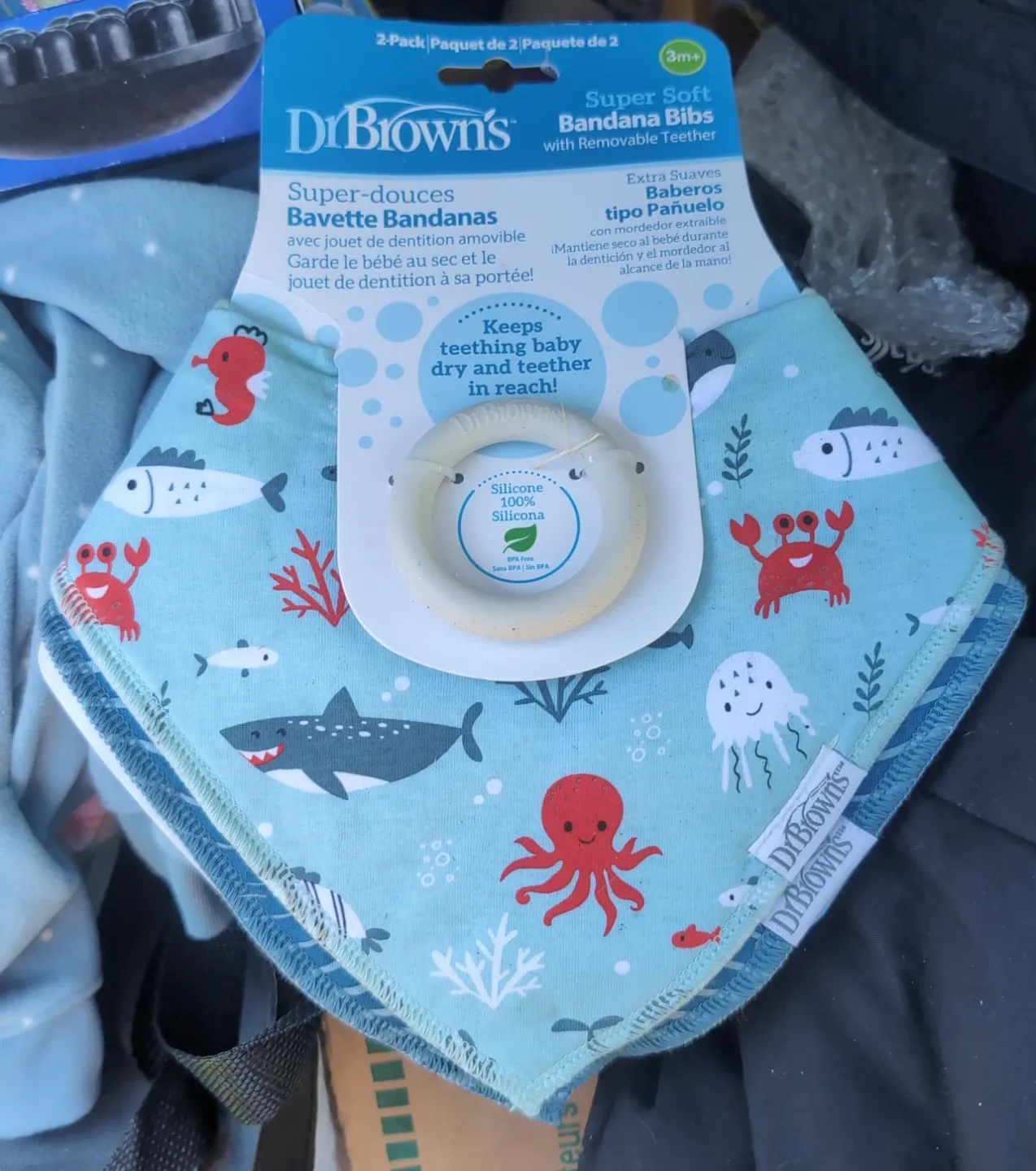 This 2-pack of Dr. Brown's bandana bibs comes with a removable teether. They're designed to keep baby dry and the teether is always within reach! The bibs are made of super soft material and the teether is 100% silicone.