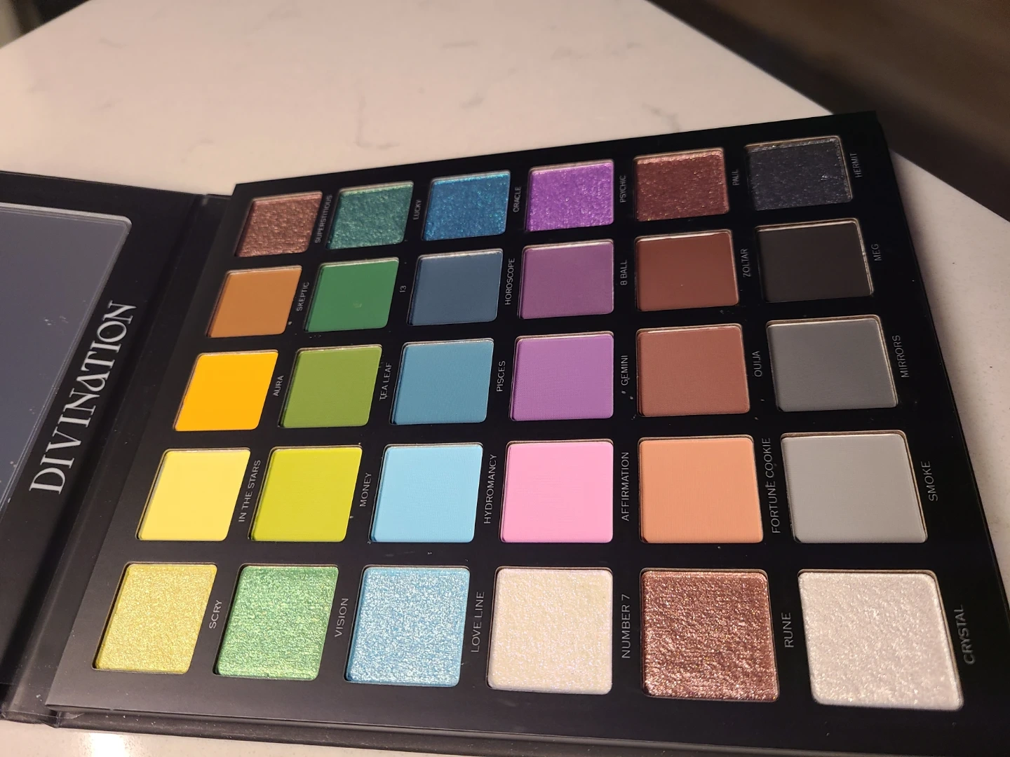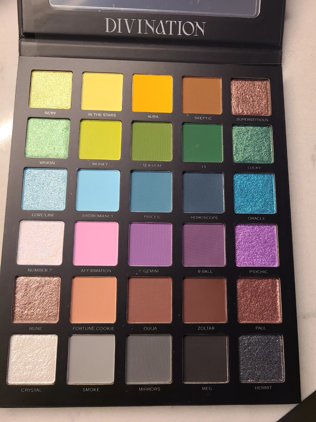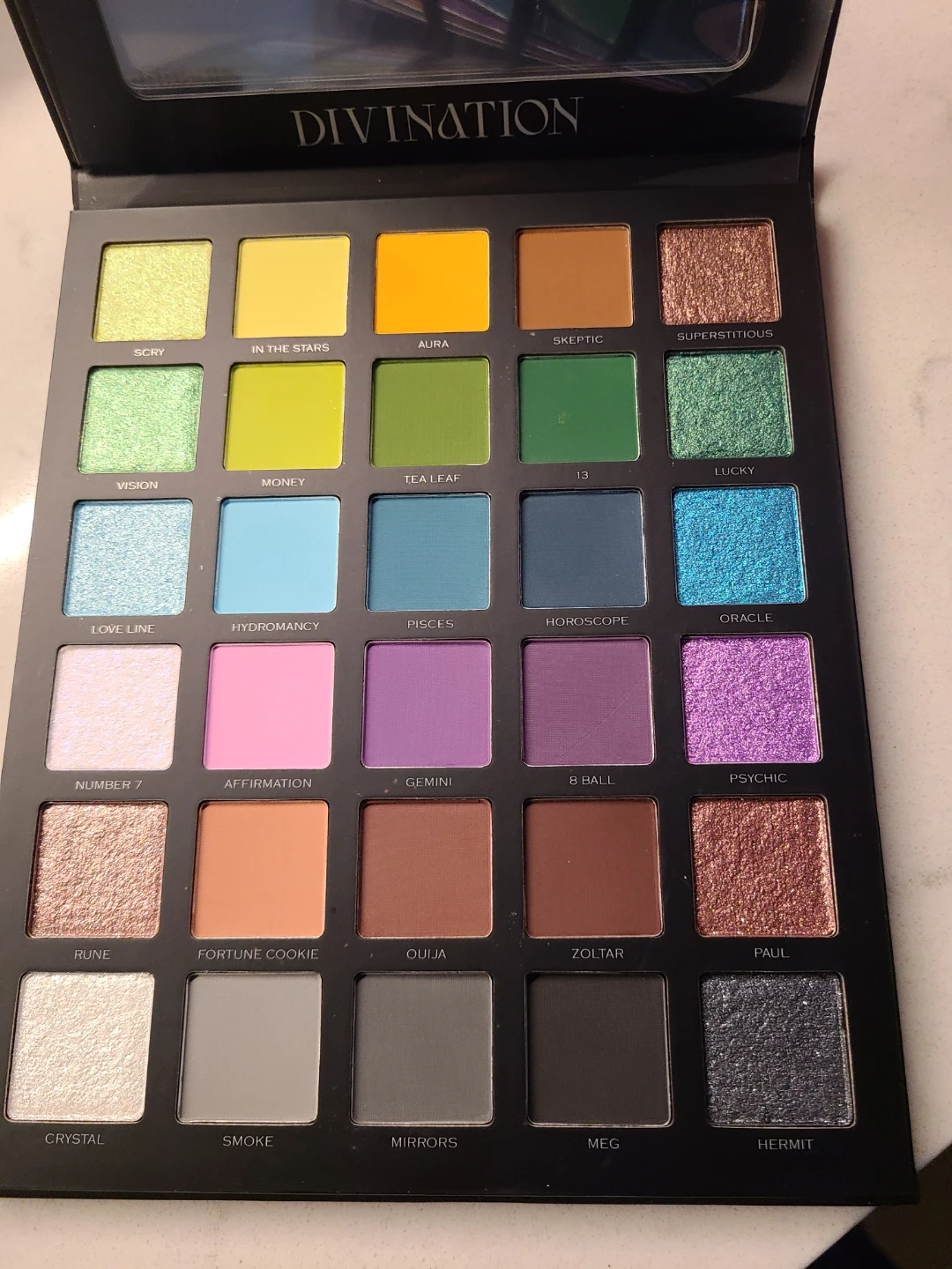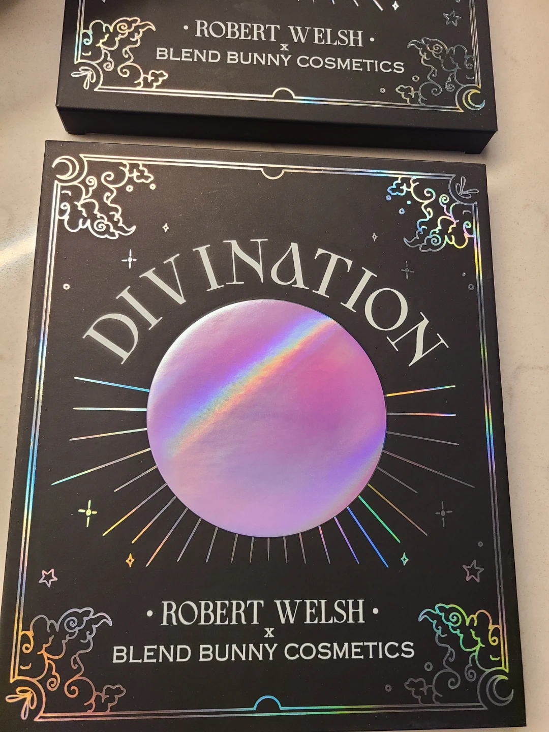 Divination Eyeshadow Palette by Blend Bunny Cosmetics. It features a variety of colourful eyeshadow shades with different finishes. The palette is part of a collaboration with Robert Welsh.