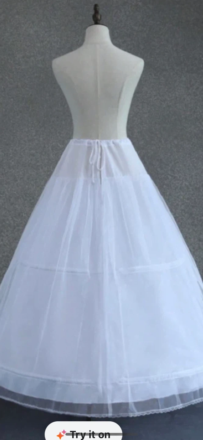 This is a white crinoline petticoat with three hoops. It's made of a sheer tulle fabric and features an elastic waistband with a drawstring for a comfortable fit. It's designed to give volume to dresses and skirts.