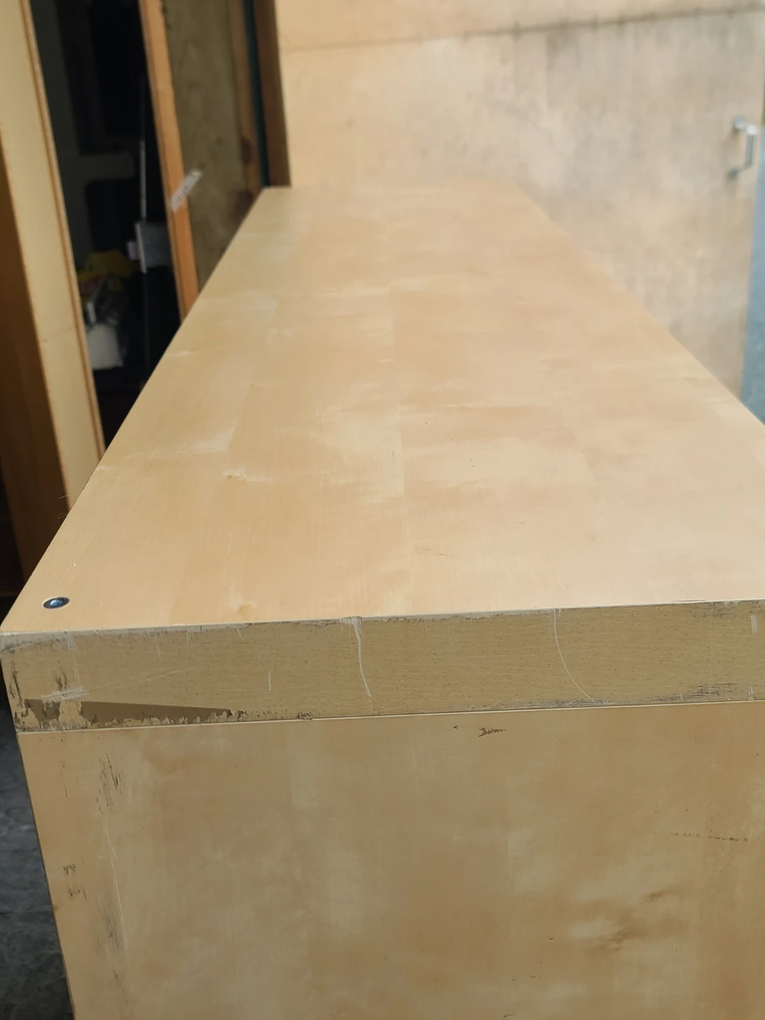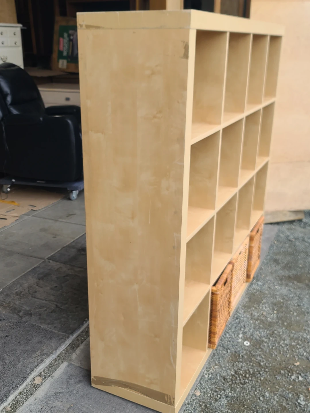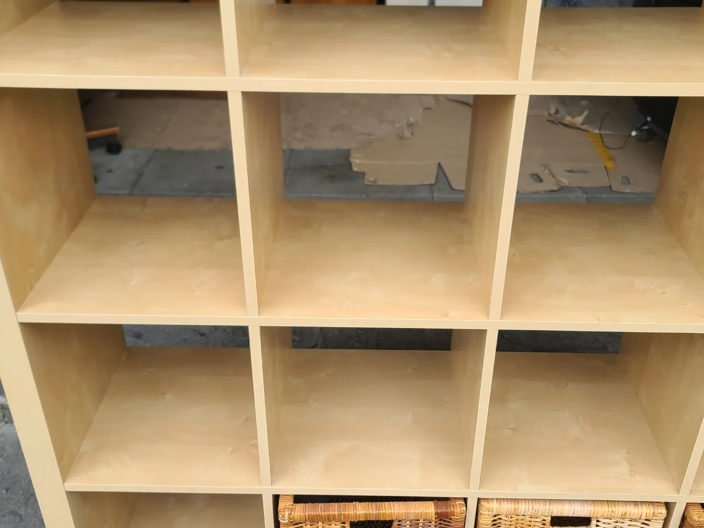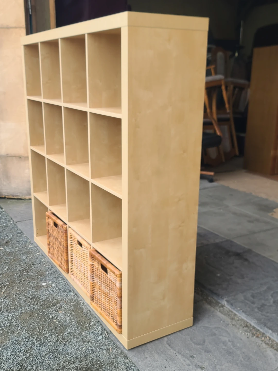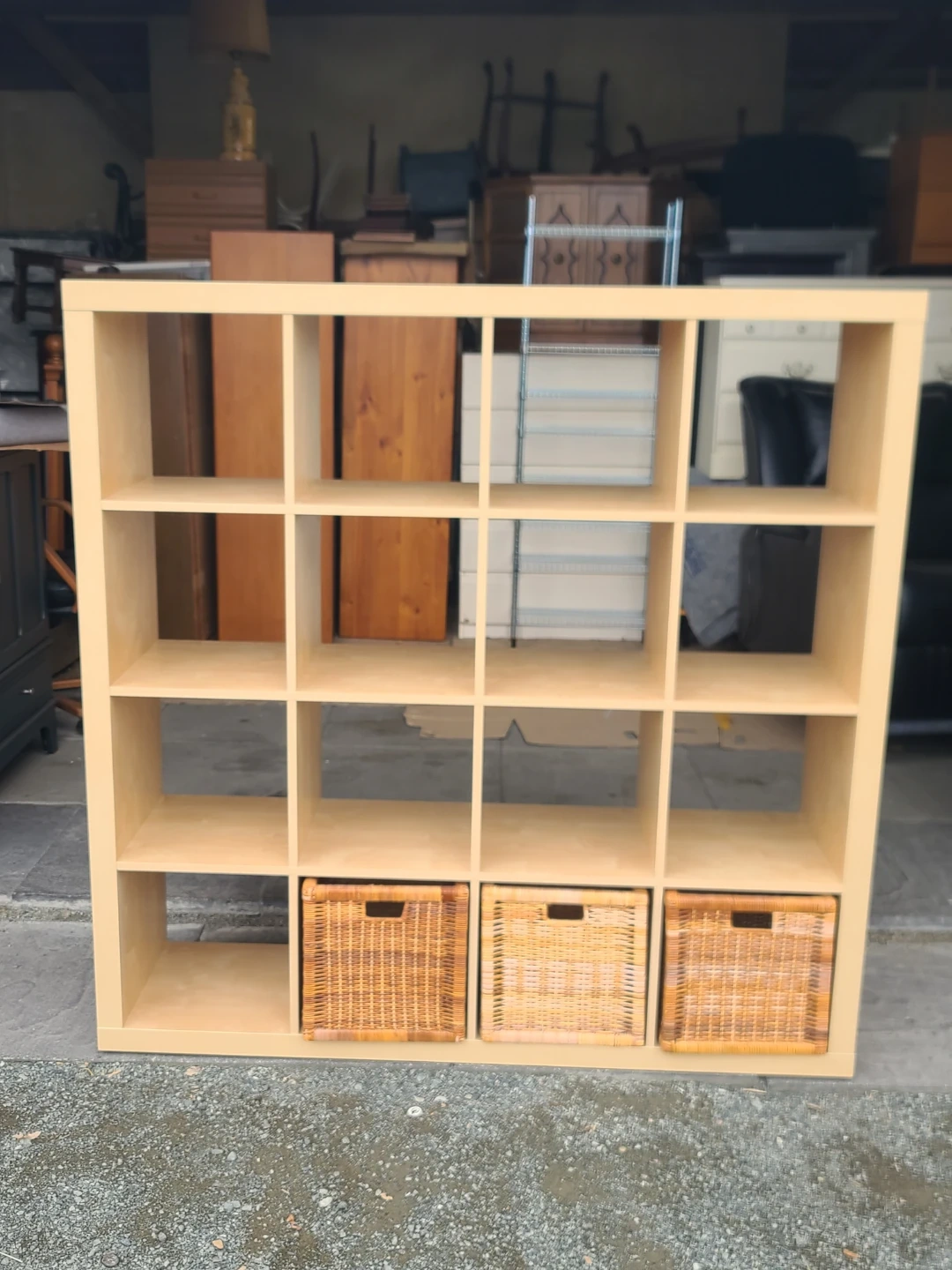 This cube storage unit has 16 compartments, perfect for organizing books, toys, or other household items. Three woven baskets are included to help keep things tidy. Light wood finish. Measurements: Width 59" X Deep 15" X Height 59". Viewing and pickup by appointment.