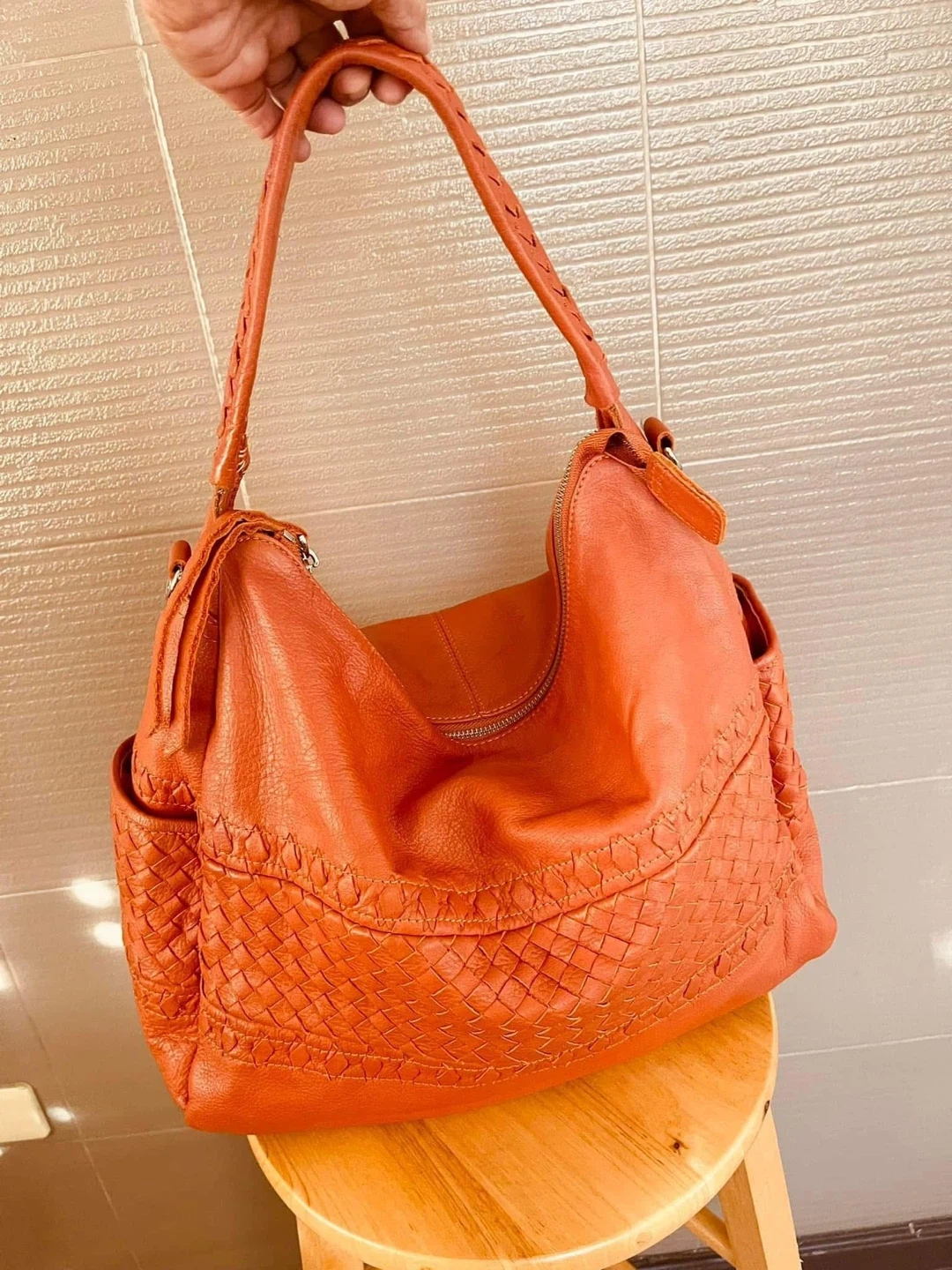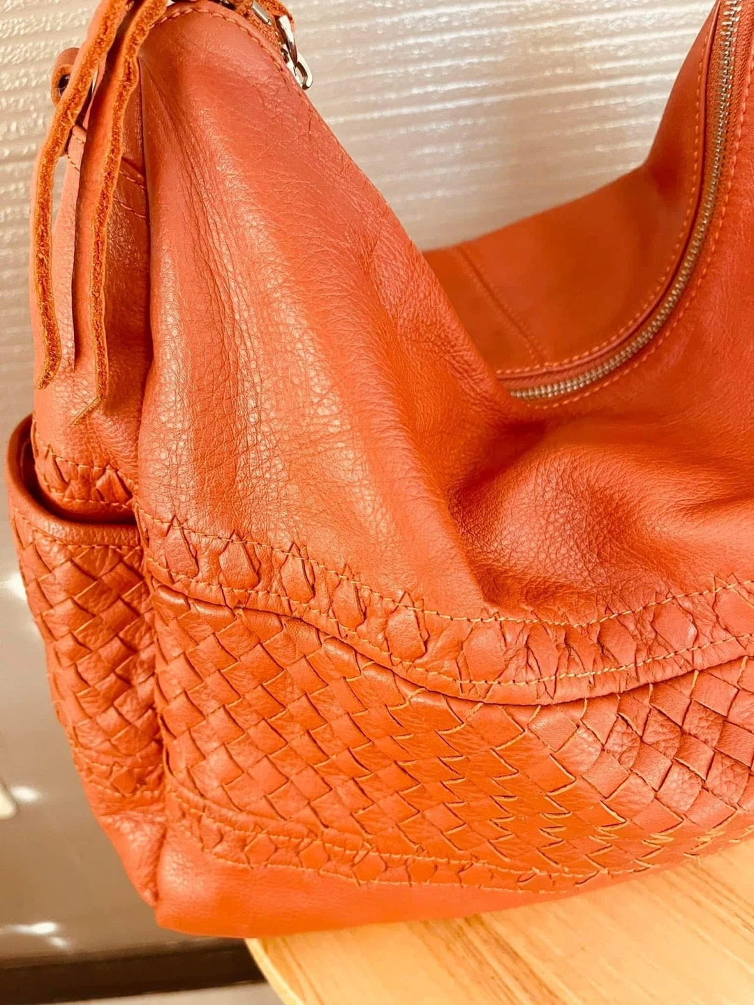 Stylish orange leather hobo bag with intricate woven detailing and silver-tone hardware. It features a zip-top closure and multiple interior pockets for organization. Perfect for everyday use!