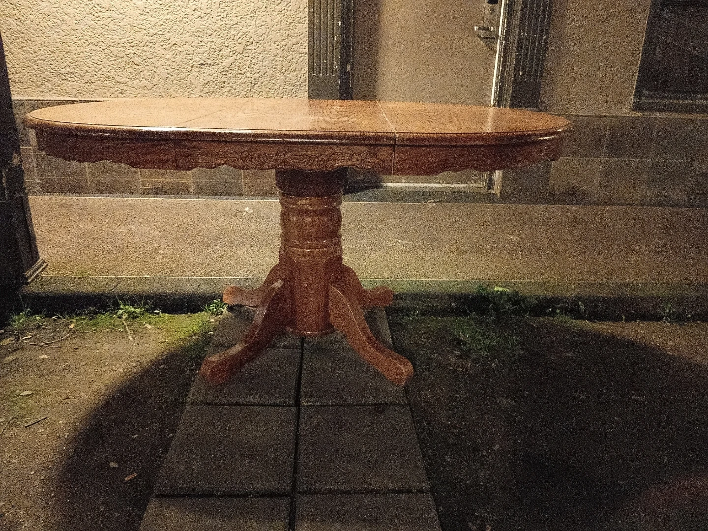This is a solid wood dining table with a pedestal base. It features an oval-shaped tabletop with a decorative carved edge. The table has an extension leaf for added space. Minor wear is visible on the tabletop.