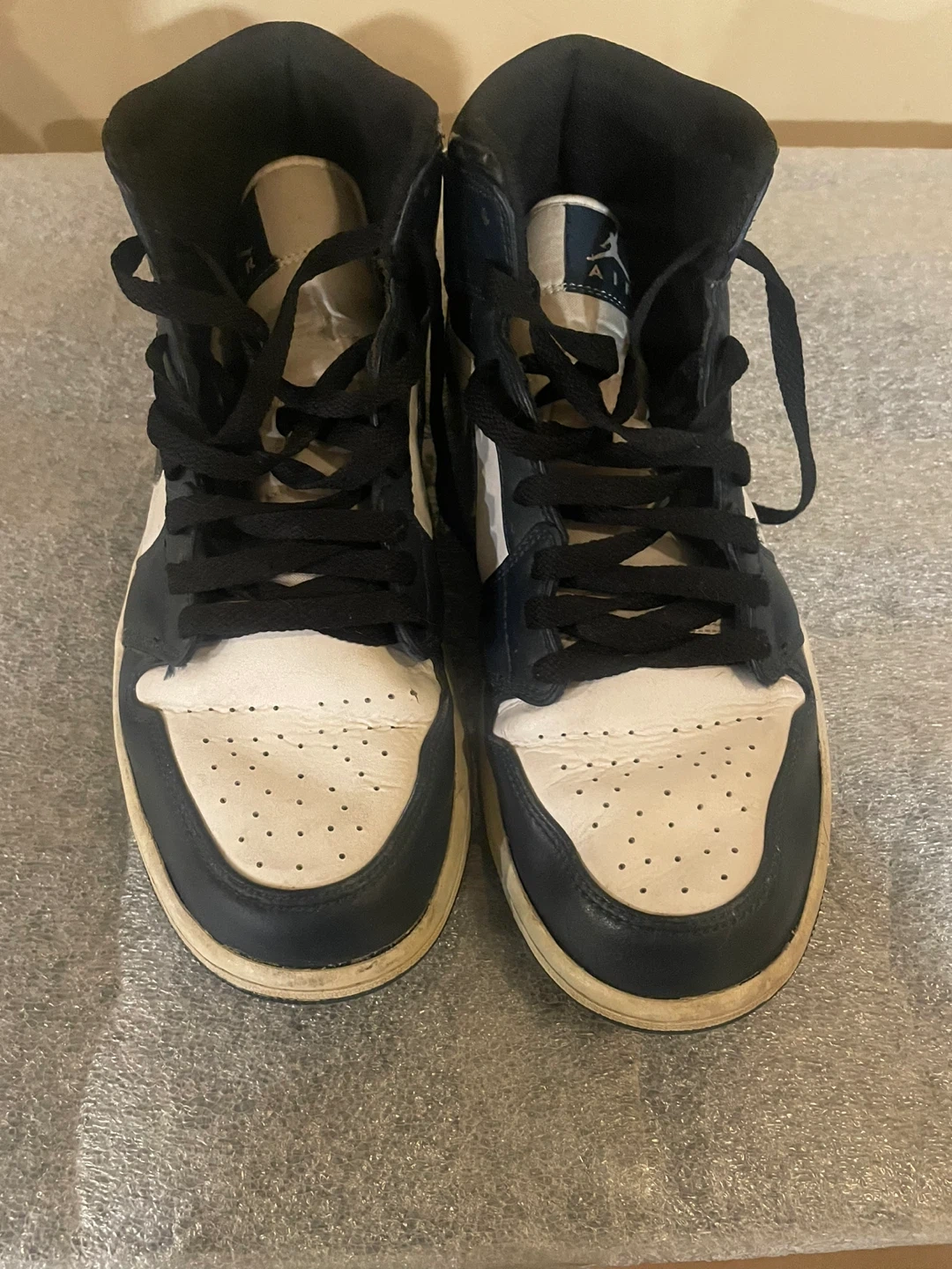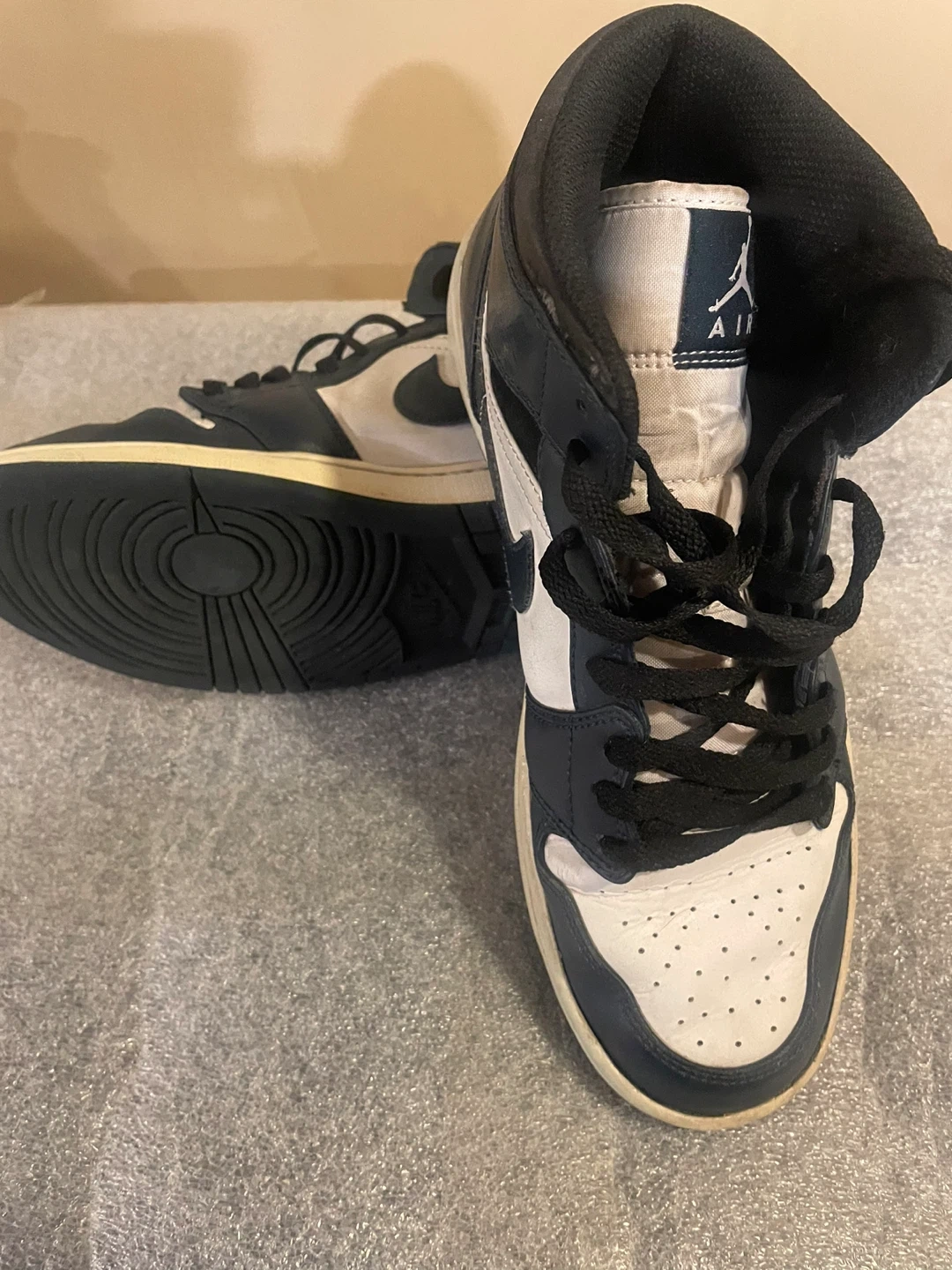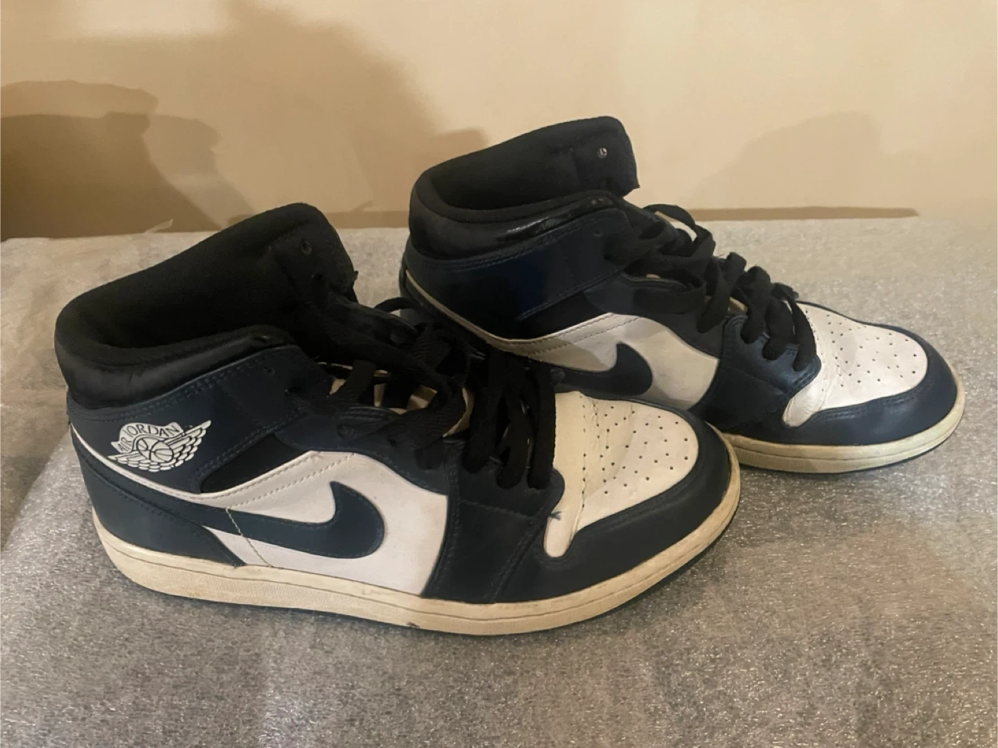 Selling a pair of Air Jordan 1 Mid basketball shoes in black and white. They've got the classic Jordan style and are ready for the court or everyday wear!
