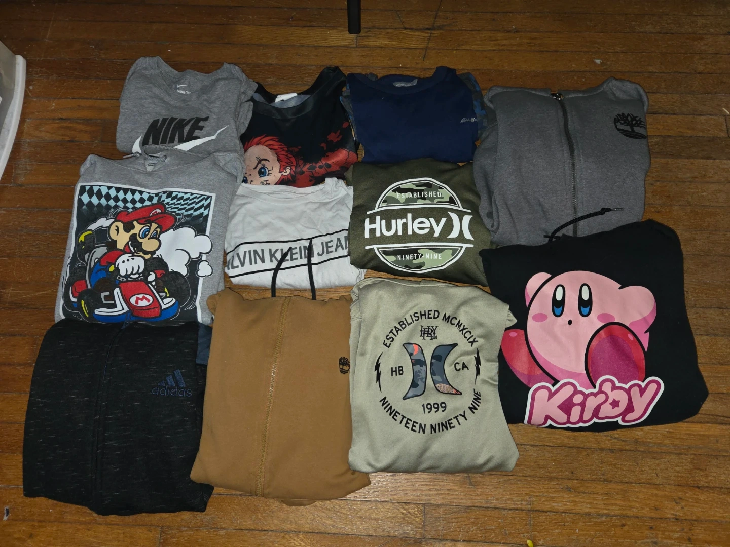 Bundle includes a Nike t-shirt, a Calvin Klein jeans t-shirt, a Hurley t-shirt, a Timberland hoodie, an Adidas zip-up jacket, and a Kirby graphic hoodie. All items are pre-owned hardly worn and ready for a new wardrobe. Great for casual wear! Size 18/20 boys