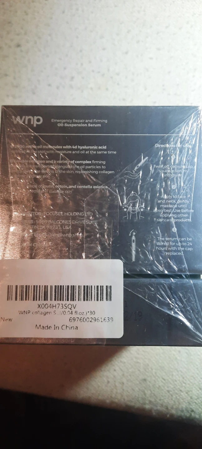 WNP collagen & 4D hyaluronic acid serum for anti-aging and firming. This oil-suspension serum comes in 30 single-use vials, each 1.2ml (0.04 fl oz). Contains 2000 oil-suspended particles for firmer, more radiant skin.