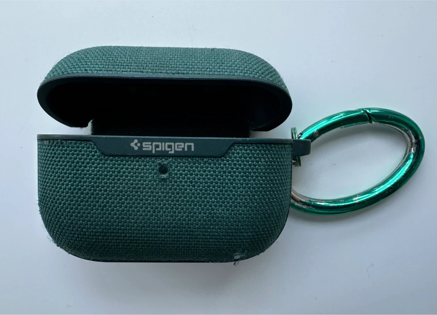 This Spigen case provides protection for your AirPods Pro. It comes with a green carabiner for easy attachment. The case is made of a durable fabric material.