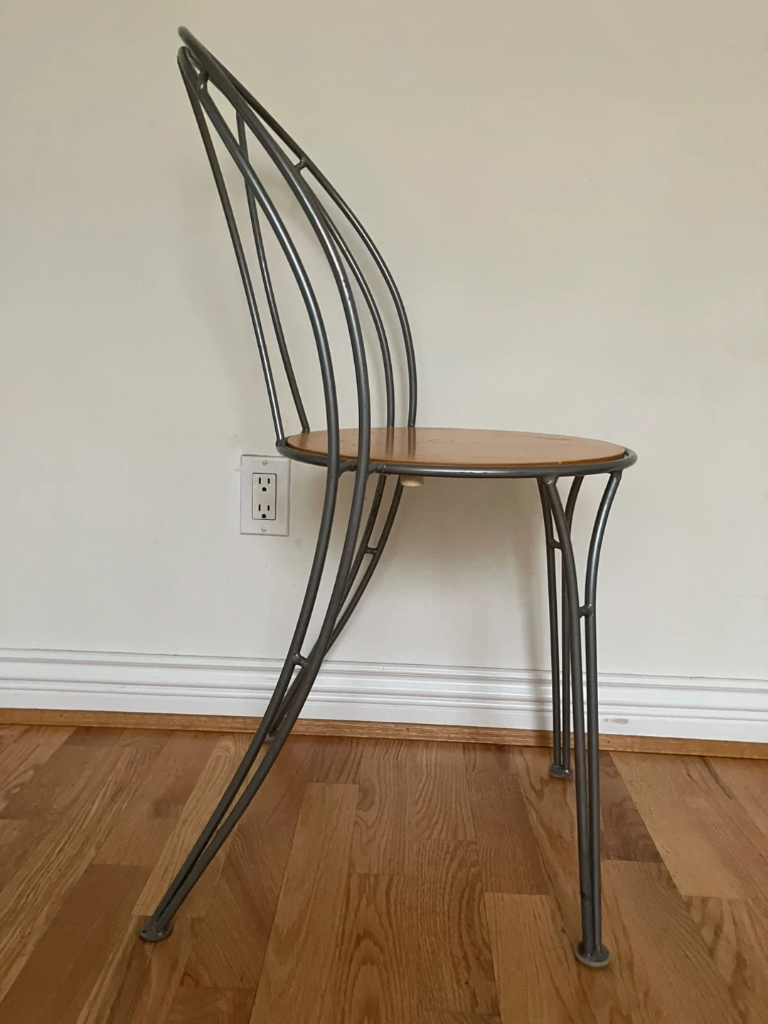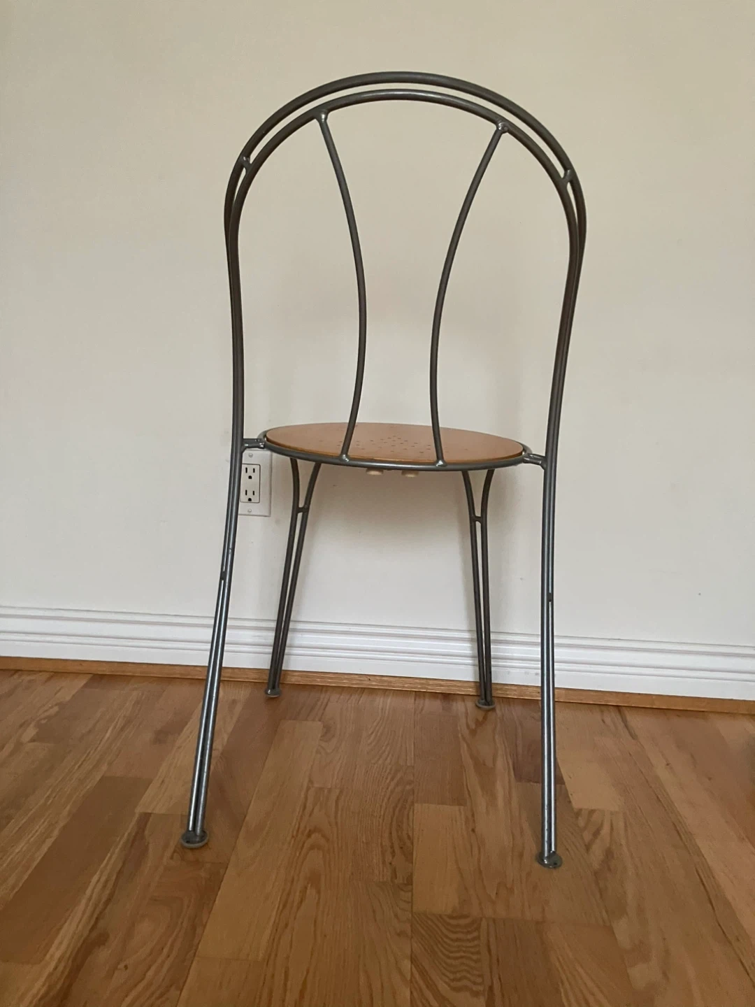 This bistro chair features a curved metal frame with a wooden seat. It's a stylish accent piece for any space. The seat is round and has small perforations.