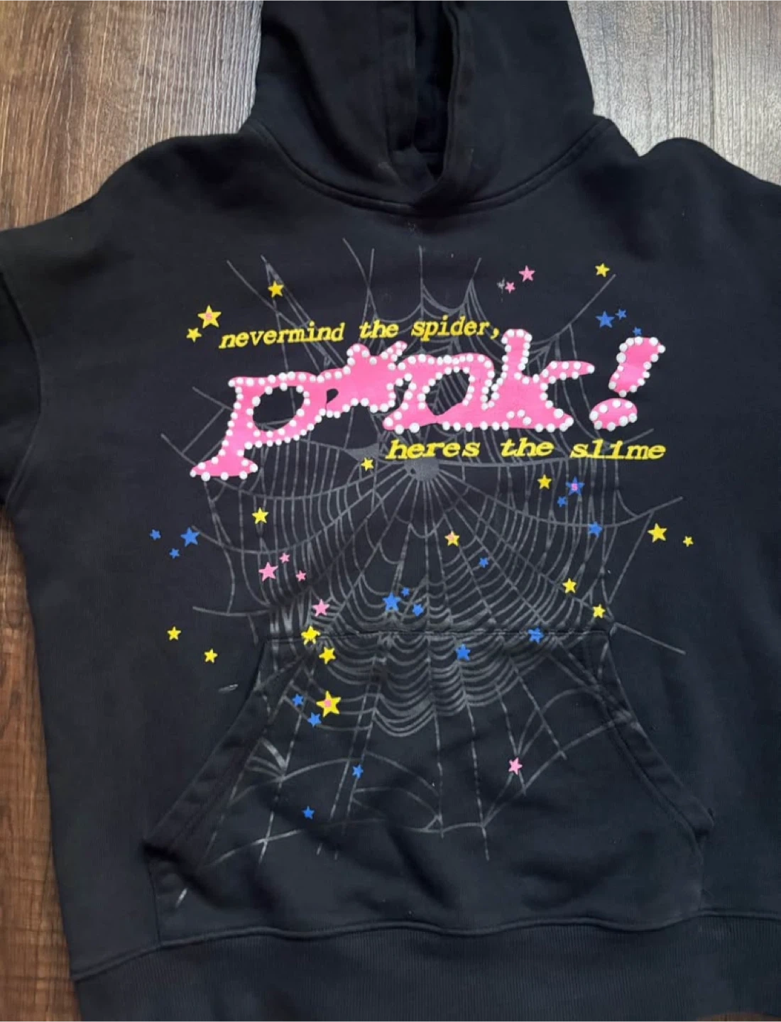 This black hoodie features the "pink! heres the slime" graphic with a spiderweb design. It's made of a comfortable cotton blend. Great for casual wear!