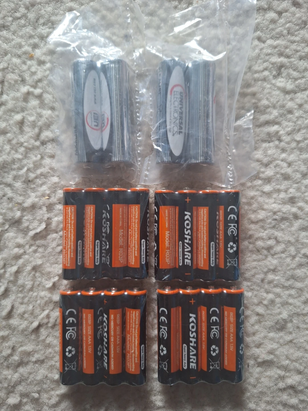 This is a bulk pack of 12 KOSHARE AAA batteries. They're designed for super heavy duty use. Includes 4 UEI and Universal Electronics brand batteries as well. Bundle deal - get them all for only $5!
