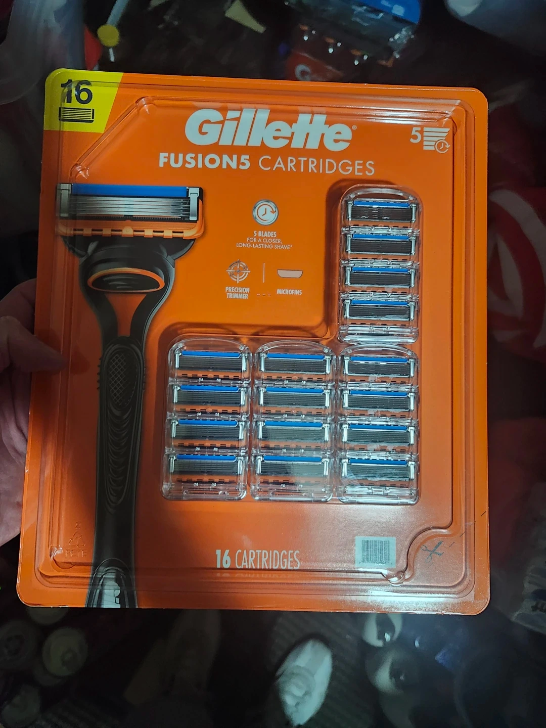 This Gillette Fusion5 set includes one razor handle and 16 replacement cartridges. Each cartridge features 5 blades for a close shave and a precision trimmer. This pack offers a long-lasting supply of cartridges.