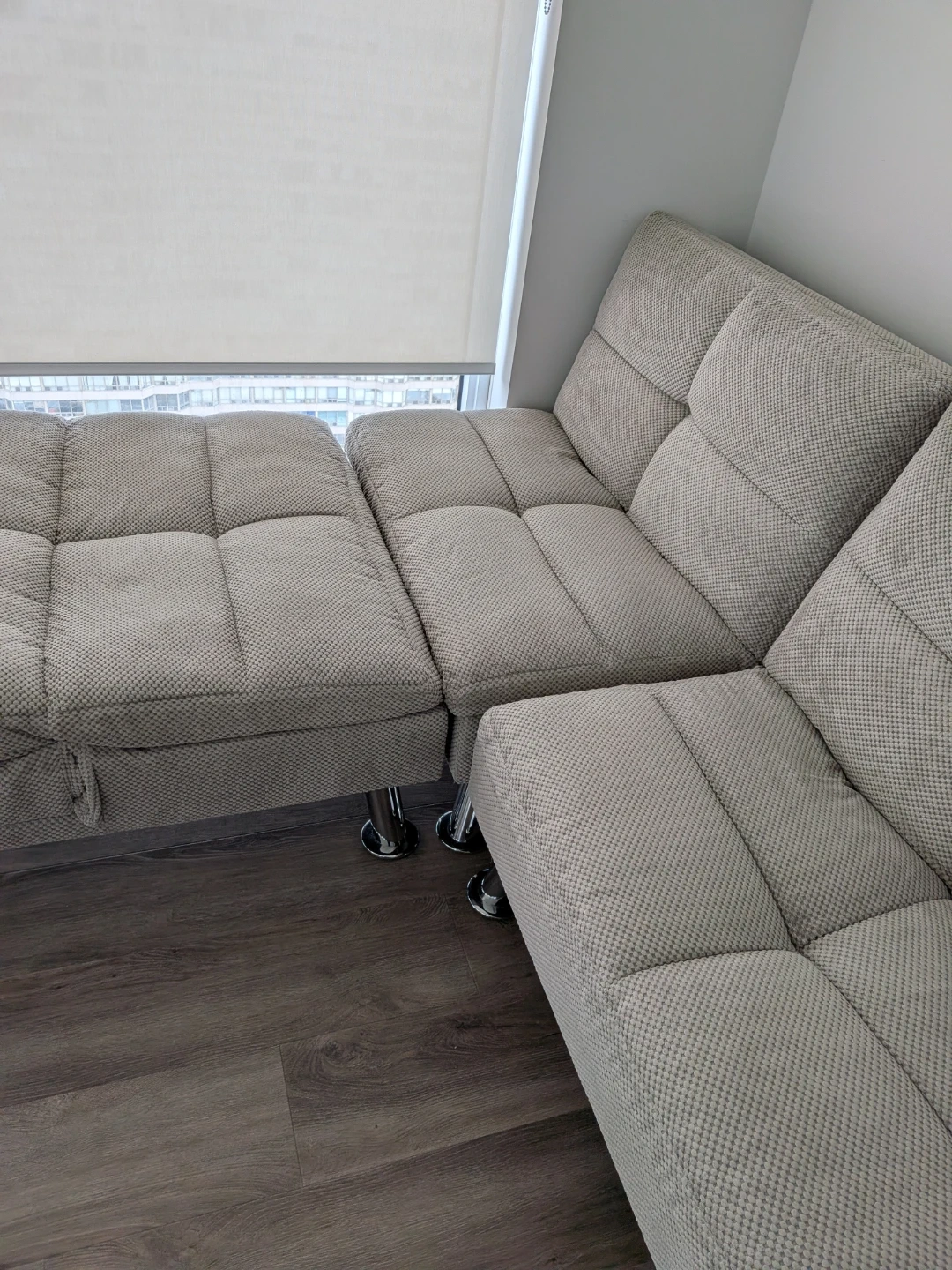 You can arrange them the way you want. The fabric is totally clean. It comes with 2 cushions. We used for 3 years. Pick up only!