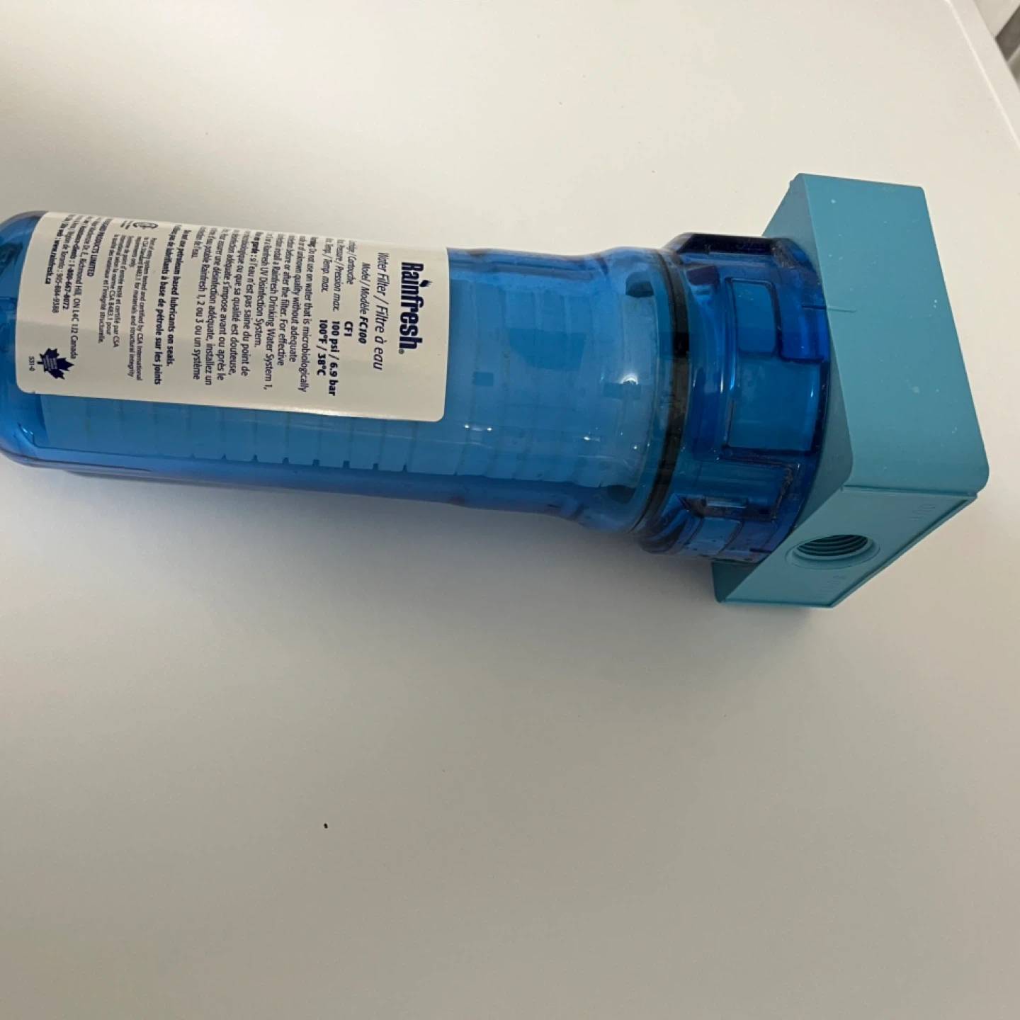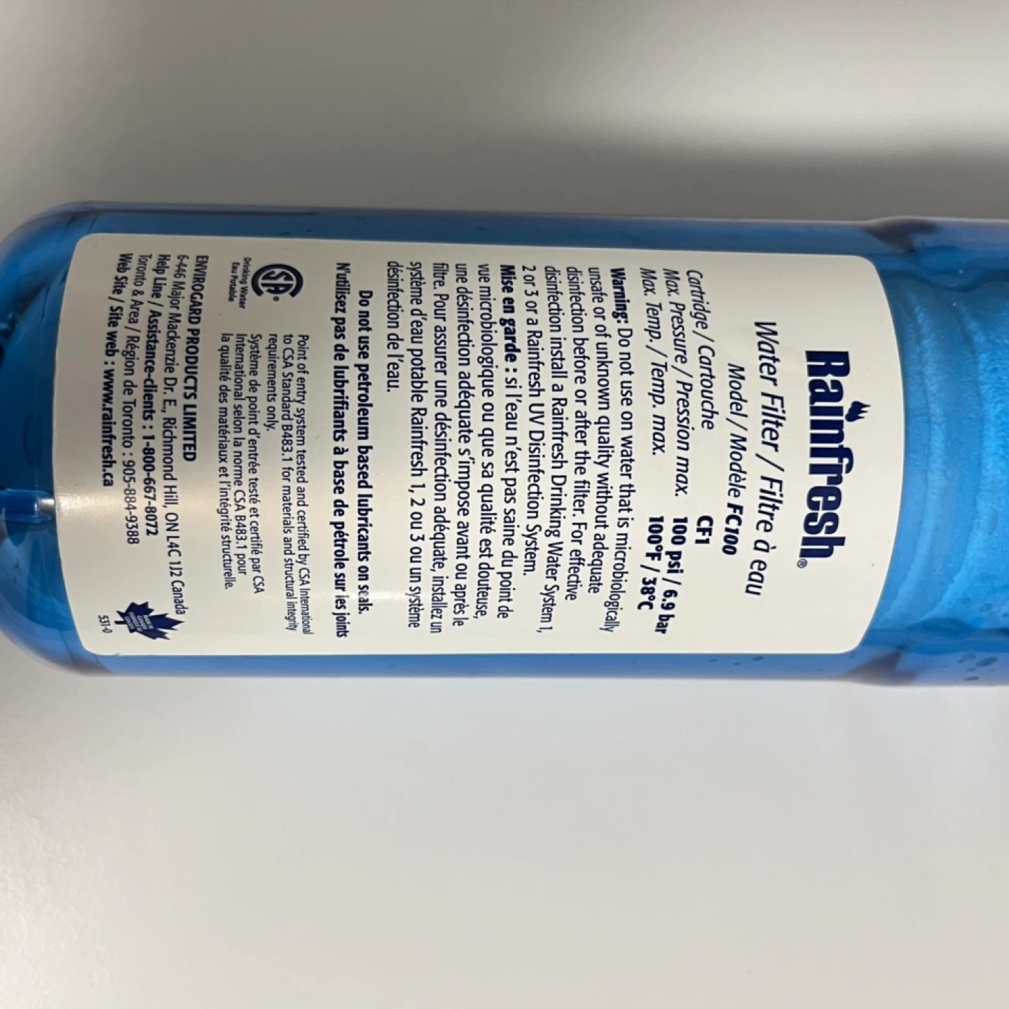 This is a Rainfresh F100 water filter cartridge. It's designed for point-of-entry systems. Max pressure is 100 psi, 6.9 bar.