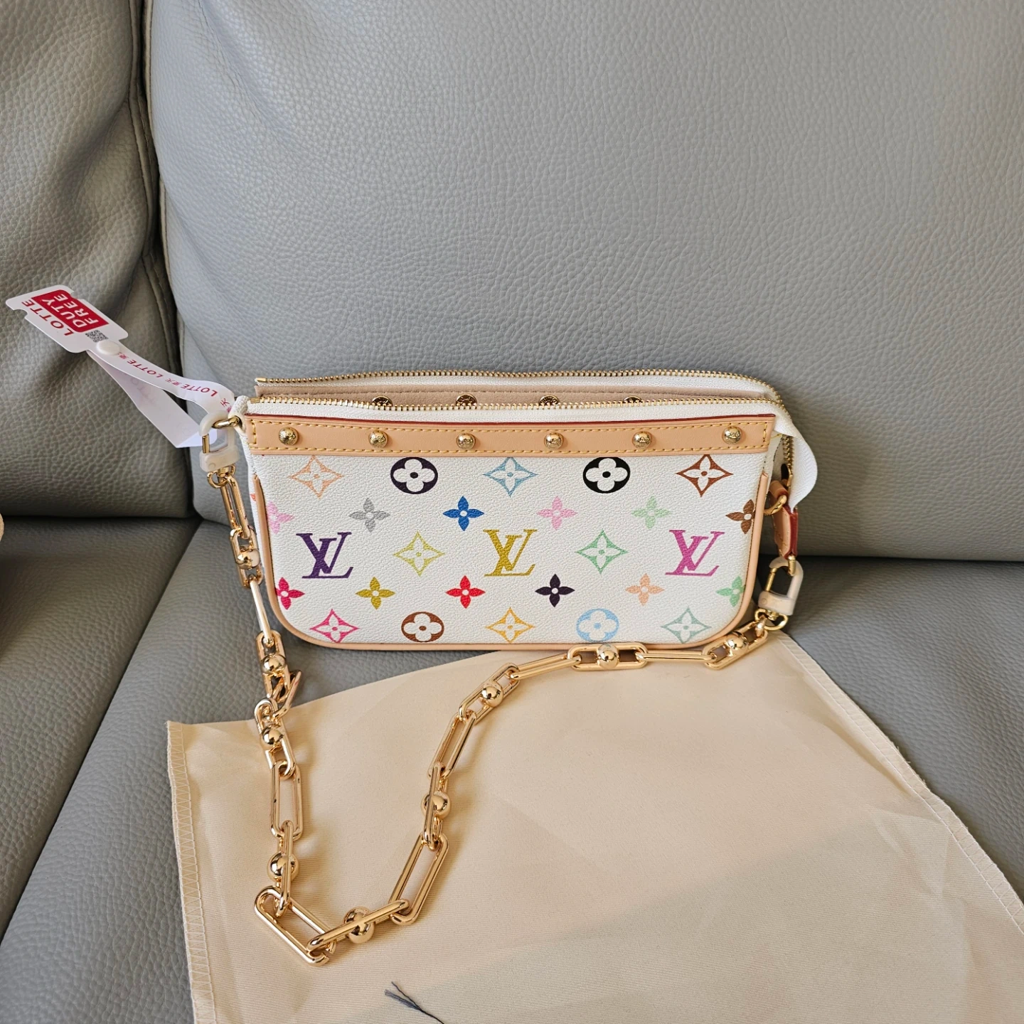 This Louis Vuitton mini pochette features the classic monogram print. It comes with a detachable leather strap and a dust bag. This bag is perfect for carrying essentials.