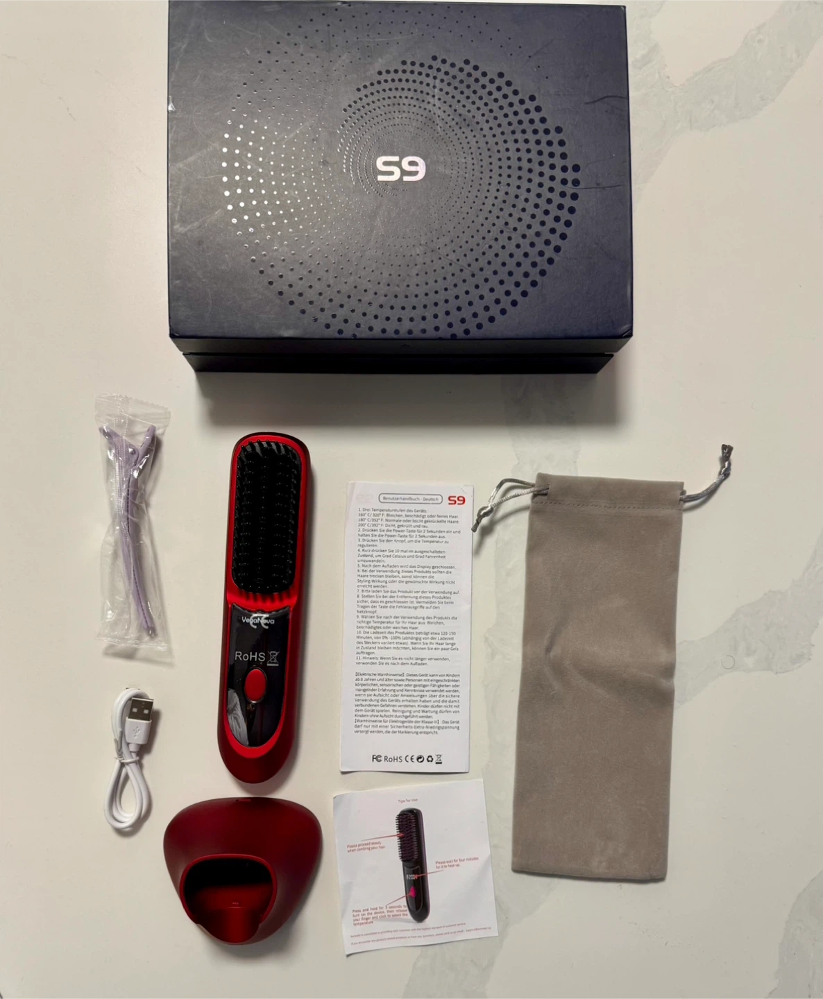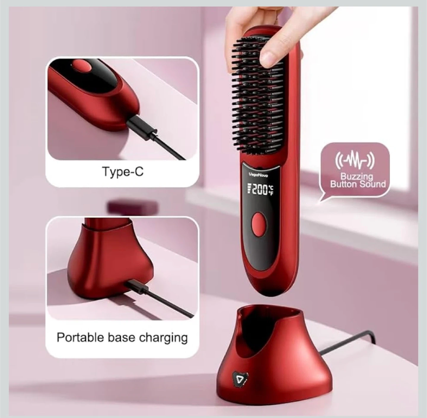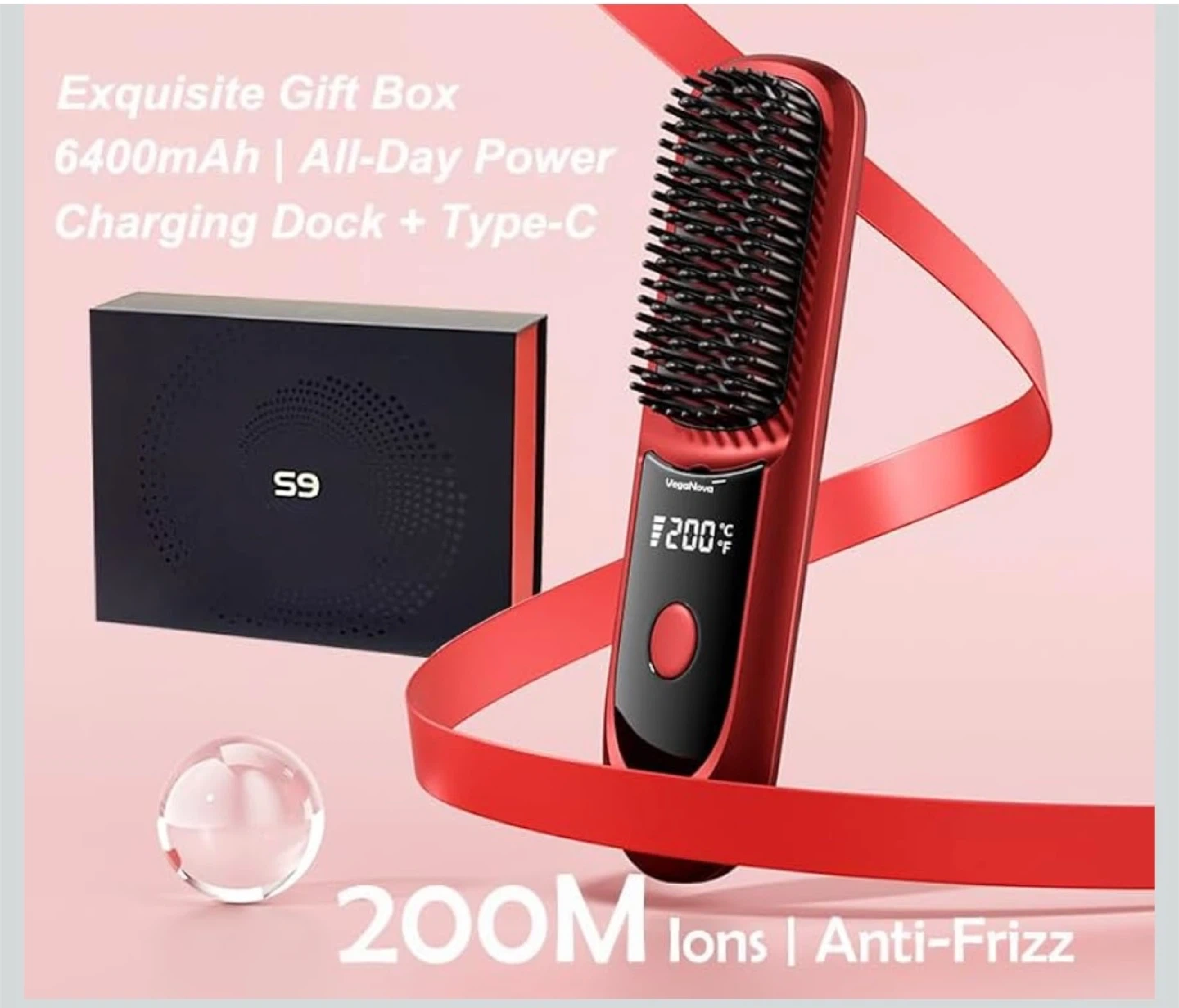 This VegaNova cordless hair straightening brush comes in red and includes a charging dock and Type-C cable. It has a 6400mAh battery for all-day power and features 200M ions for anti-frizz results. It also comes with hair clips and a storage pouch. This brush offers 3 heat levels.