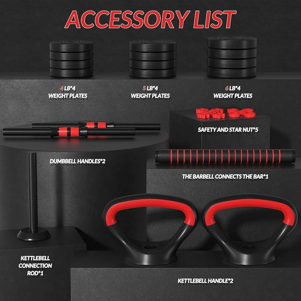 This is a 70 lbs (30 kg) adjustable dumbbell set that can also be used as barbells, kettlebells, and push-up stands. The weight is adjustable for single dumbbells (6-35 lbs), kettlebells (4-27.5 lbs), and barbells (8-71 lbs). The dumbbell pieces are made of durable, odorless PE material with an iron, mud, and sand fill, designed to protect floors. The dumbbell bar has a non-slip texture for a better grip. The barbell connector is made with a steel tube and 20mm thick foam for comfort during exercises like neck presses. It includes four safety nuts to keep the weights secure. Easy to assemble.