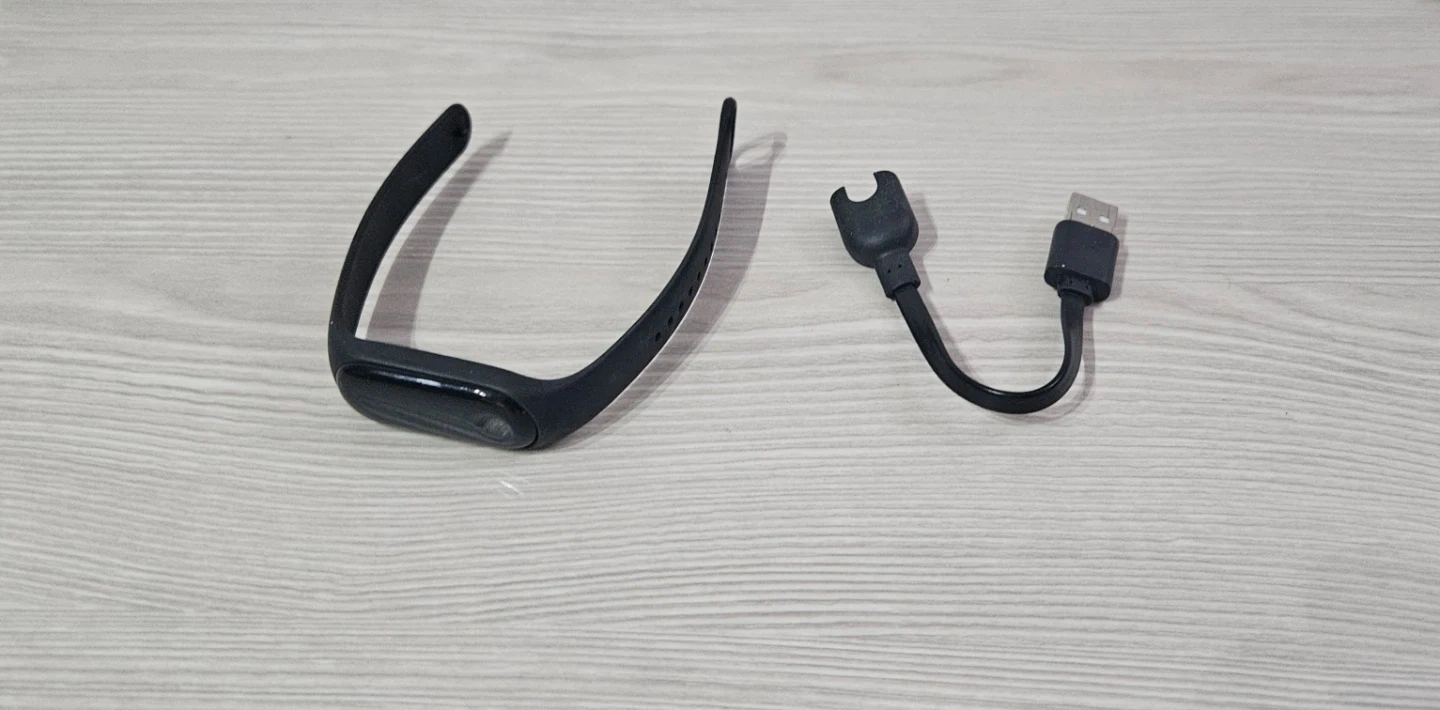 This listing is for a black Xiamo Fitness Band Version 3, along with its USB charging cable. The strap is made of flexible material, suitable for daily wear. The charger cable connects via USB for convenient power-ups.