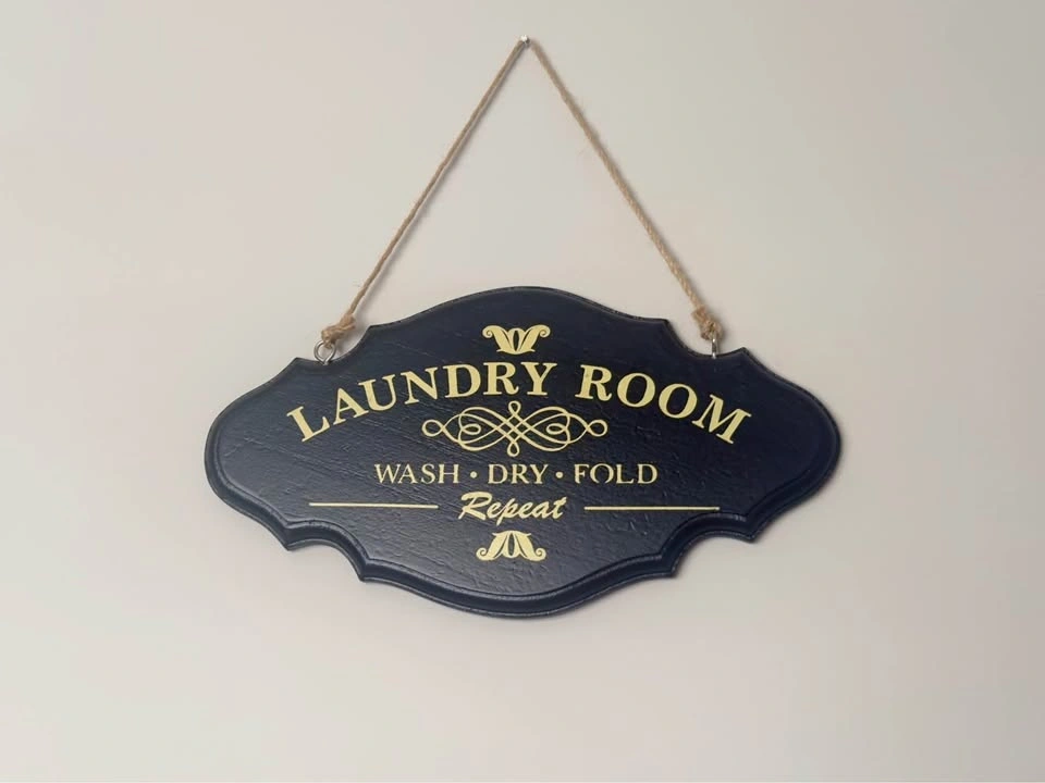 Stylish hanging sign – “Laundry Room: Wash • Dry • Fold • Repeat.” Perfect for laundry area décor. Lightweight & easy to hang. Modern farmhouse style. Great condition.