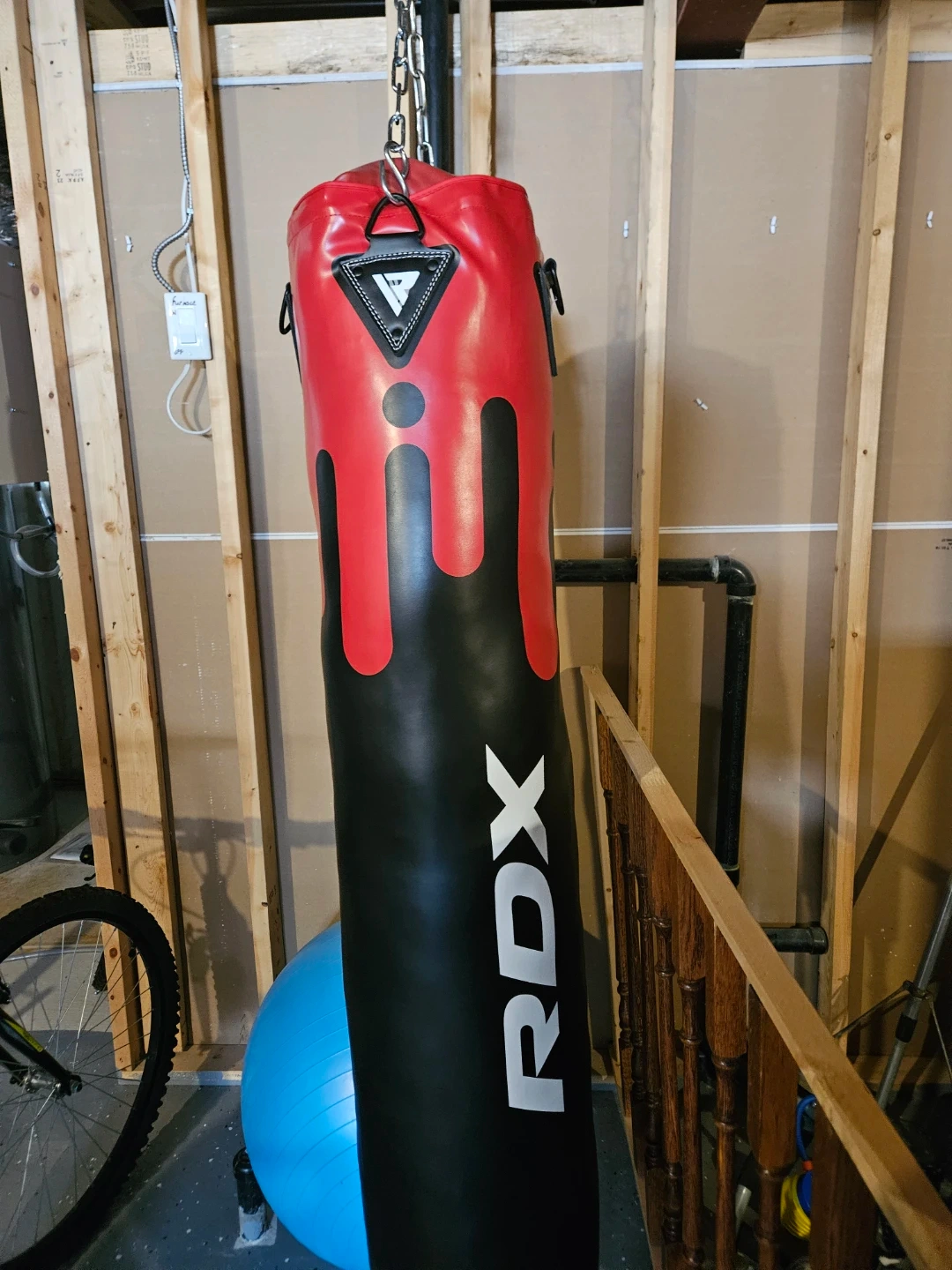 This is an RDX brand punching bag. It's red and black with a unique design. The bag is ready for training! Its already filled 50lbs, but is not at full weight capacity.