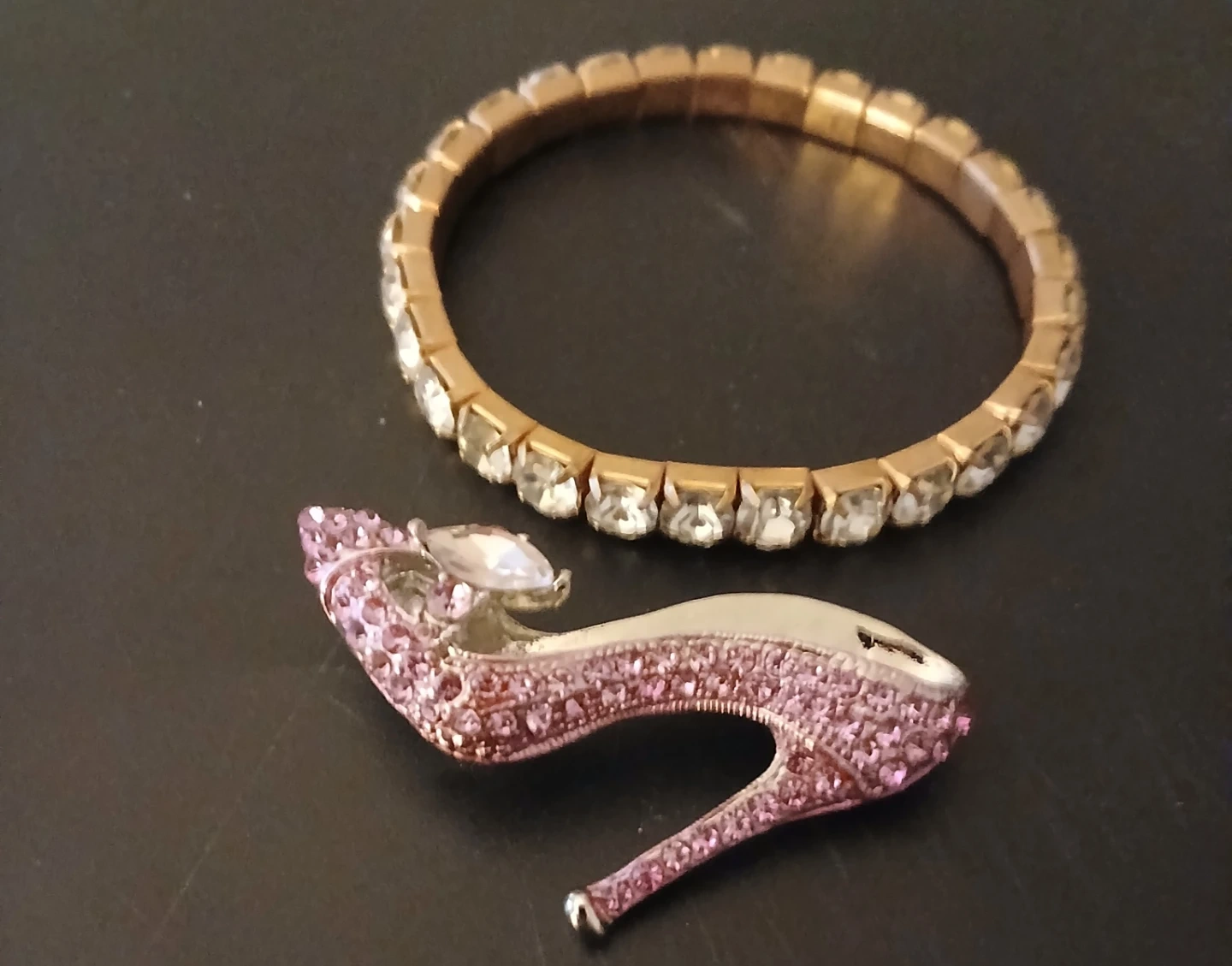Set includes a stretch bracelet with clear rhinestones and a pink high heel brooch encrusted with pink rhinestones. It's a sparkly accessory combo!