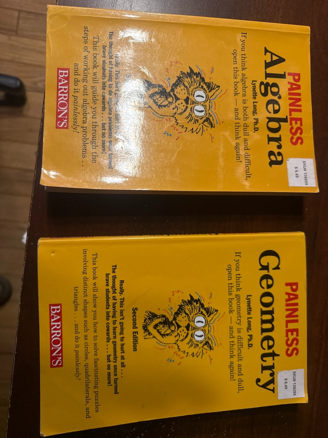 Two books covering Algebra and Geometry by Lynette Long, Ph.D. Both are second editions from Barron's. They aim to guide students through problems and concepts painlessly!
