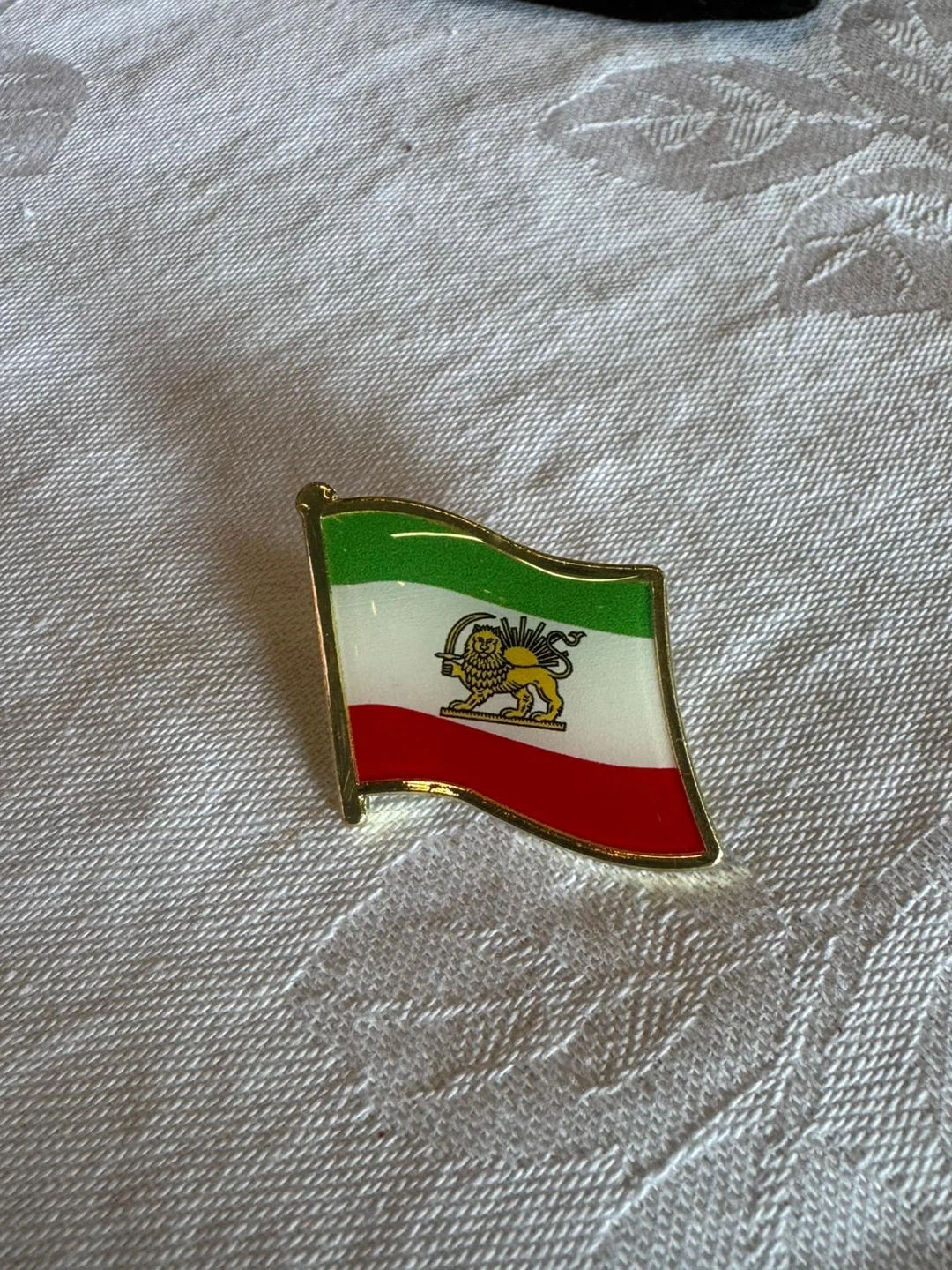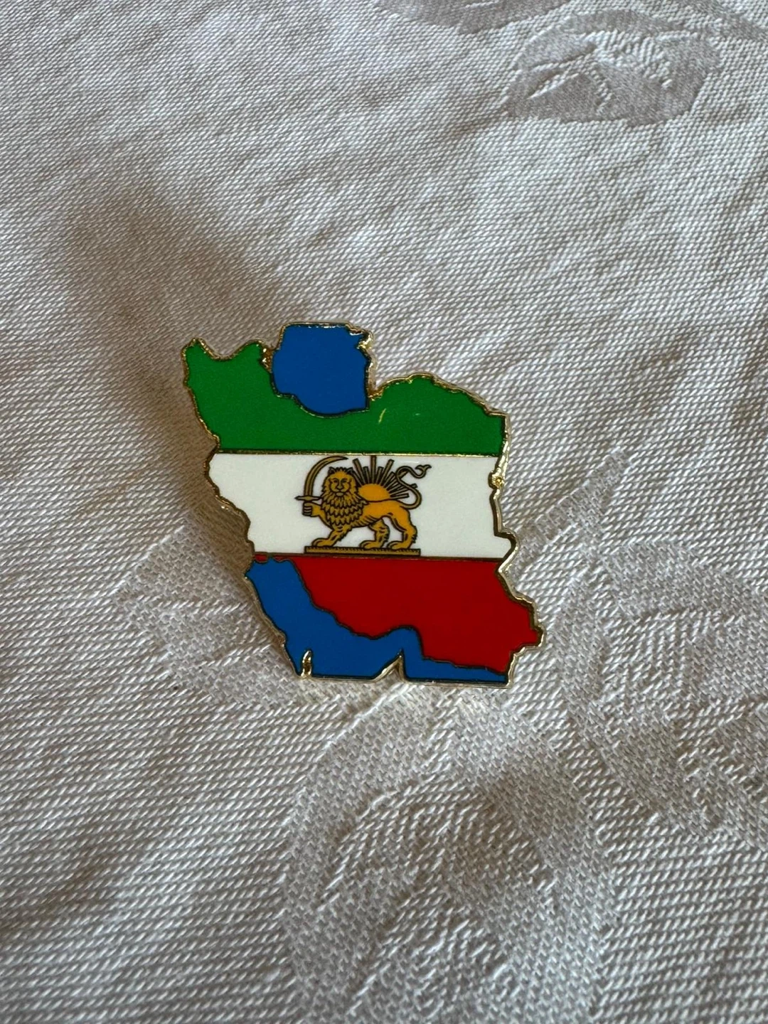 This set includes three pins: one shaped like the Iranian flag, another depicting the map of Iran with the flag colours, and a decorative oval pin featuring a lion and sun emblem, all with gold-toned metal detailing. The oval pin comes in a small black drawstring pouch. Great for showing national pride! Depends on which one you want