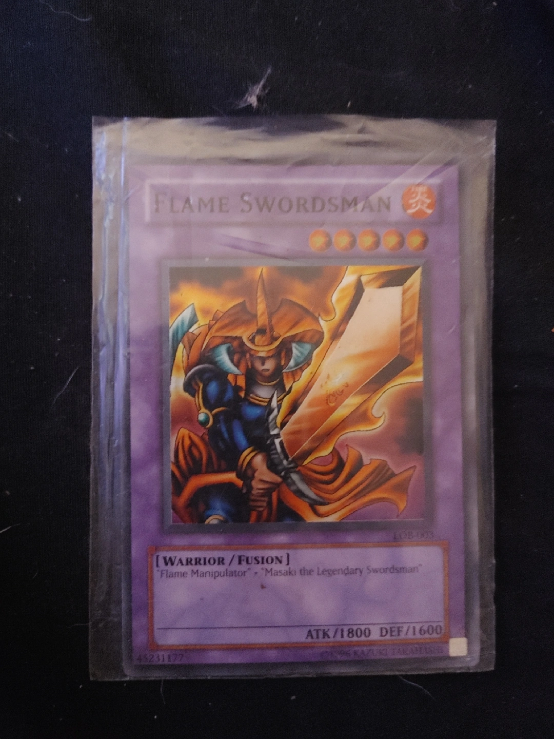 25Selling a Yu-Gi-Oh! card featuring the Flame Swordsman. It's a Warrior/Fusion monster card with ATK/1800 and DEF/1600. "Flame Manipulator" and "Masaki the Legendary Swordsman" are listed on the card