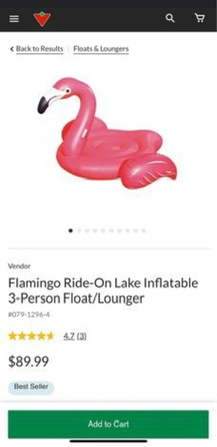 Pink flamingo-shaped inflatable float. Great for lakes. Three-person capacity.