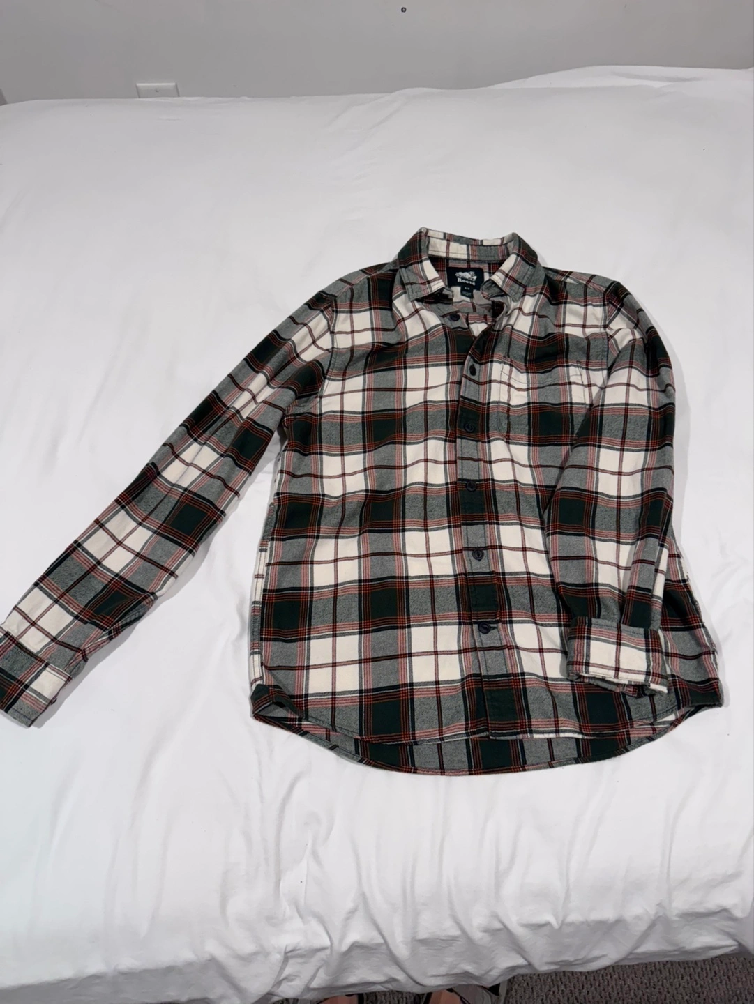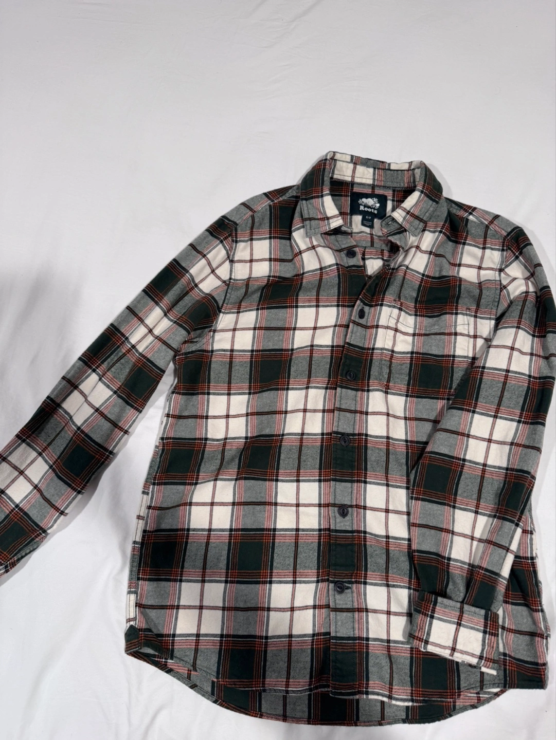 47Long sleeve button up flannel shirt. Green, white and orange plaid pattern. One chest pocket. Good condition.