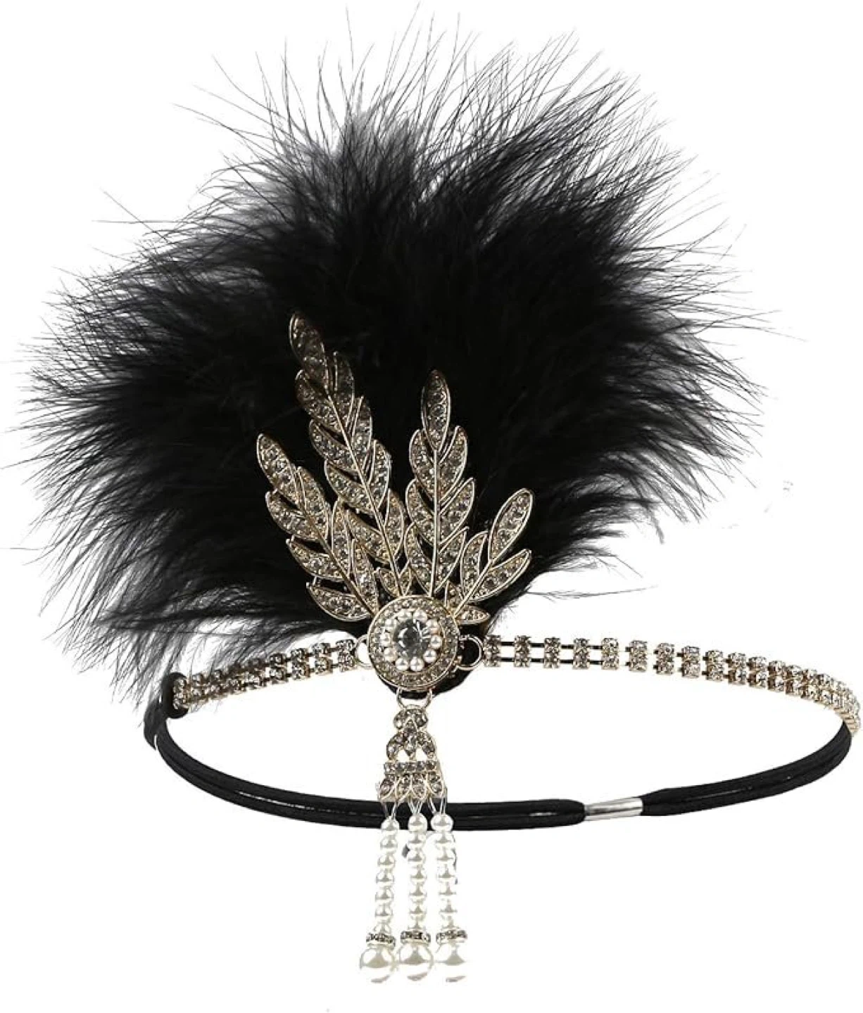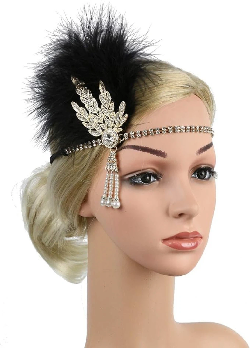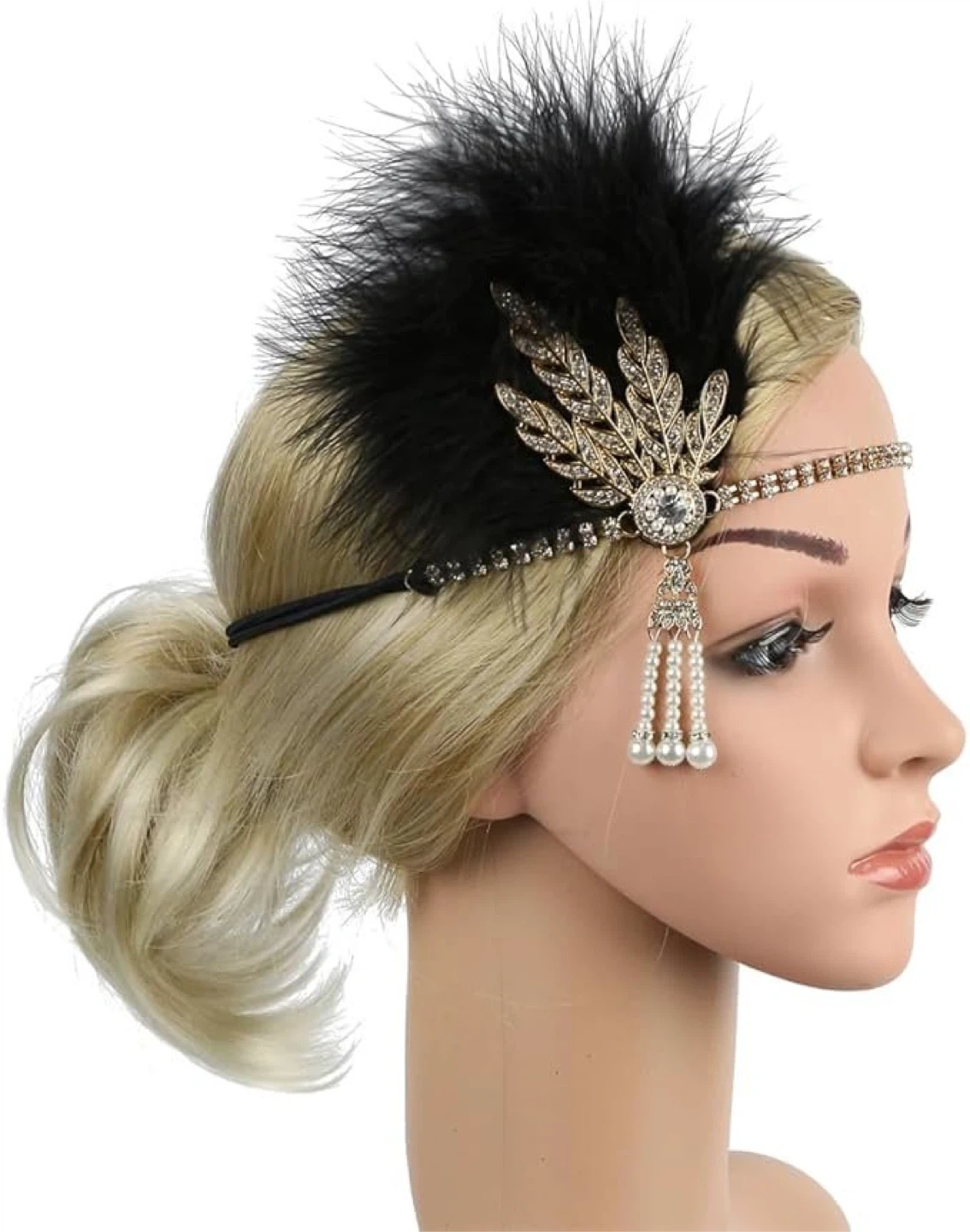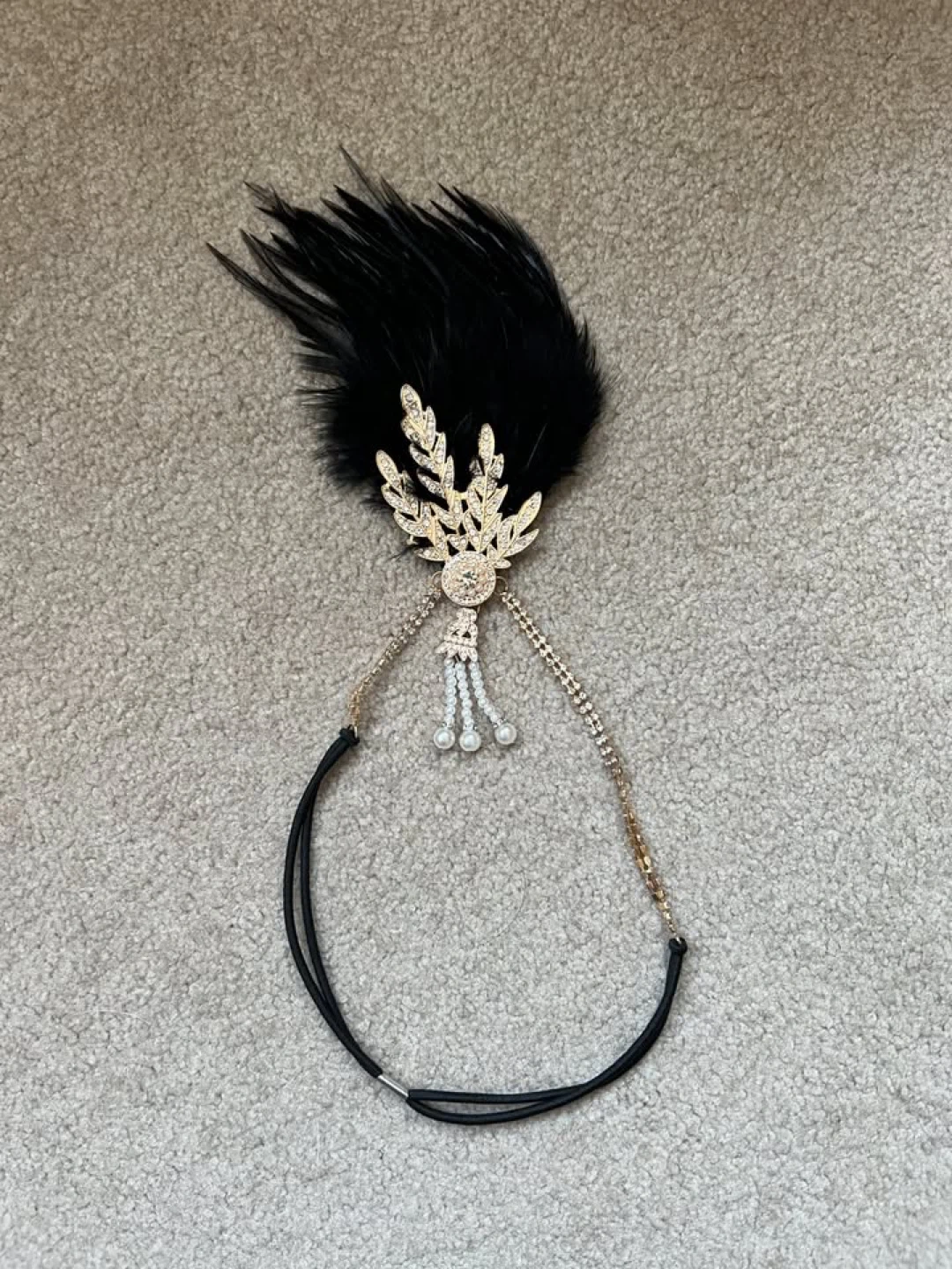 Add a touch of vintage glamour with this stunning flapper headband! It features a black feather accent, intricate gold-coloured detailing, and faux pearl embellishments. Perfect for parties, costumes, or adding a unique flair to your outfit