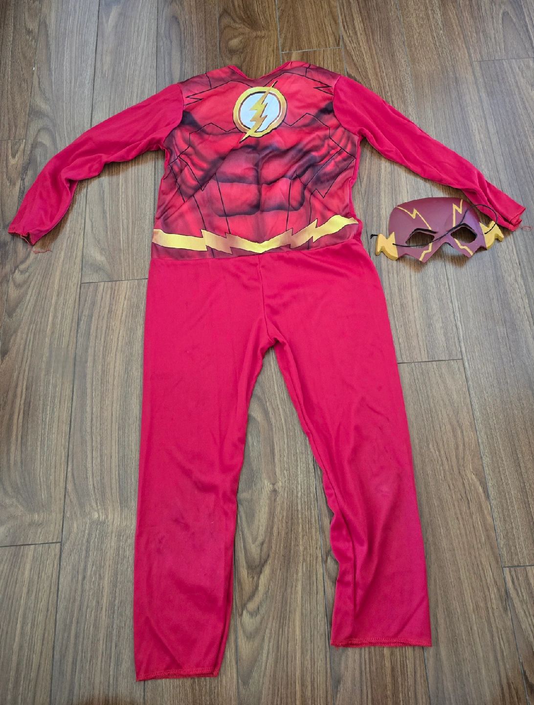 Selling a Flash costume, complete with the iconic mask! Perfect for dress-up or Halloween fun. The costume is in good condition and ready for a new superhero in training Fits for Boys 4 to 6 years
