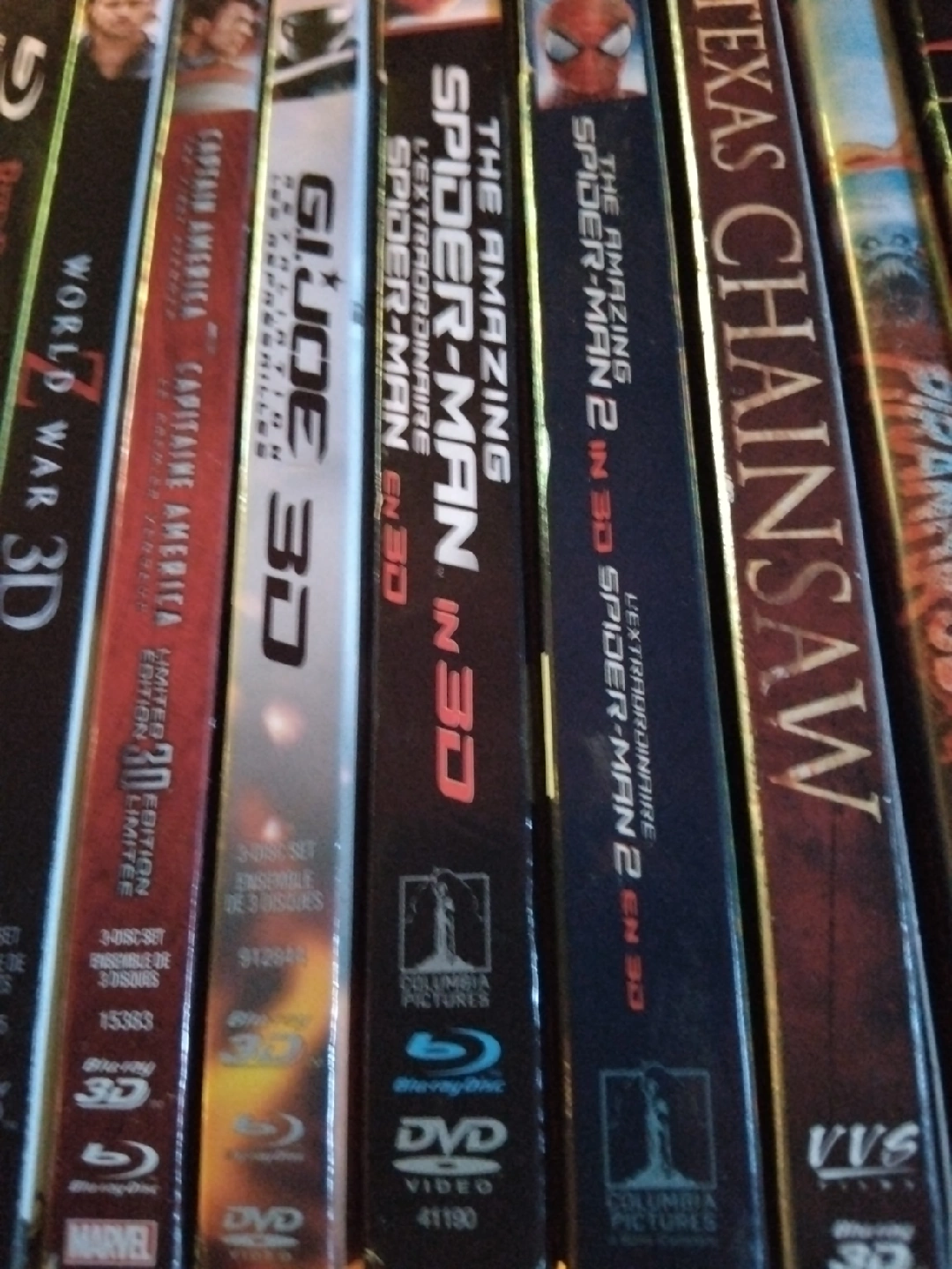 One week only β bundle deal. Selling 15 Blu-ray 3D movies β all original 3D editions. β The Amazing Spider-Man 3D is factory sealed β Horror collector titles included (Fright Night 3D, Texas Chainsaw 3D, Piranha 3D + Piranha 3DD) β Marvel & blockbuster action (Captain America, Spider-Man 2, World War Z, Clash/Wrath of the Titans, etc.) Full list (15): World War Z 3D Captain America 3D (3-disc set) G.I. Joe: Retaliation 3D The Amazing Spider-Man 3D (sealed) The Amazing Spider-Man 2 3D Texas Chainsaw 3D Fright Night 3D Clash of the Titans 3D Wrath of the Titans 3D Piranha 3D Piranha 3DD The Last Airbender 3D Conan the Barbarian 3D Immortals 3D I, Frankenstein 3D Price: $150 (works out to $10 each). After this week Iβll split horror titles separately at collector prices.