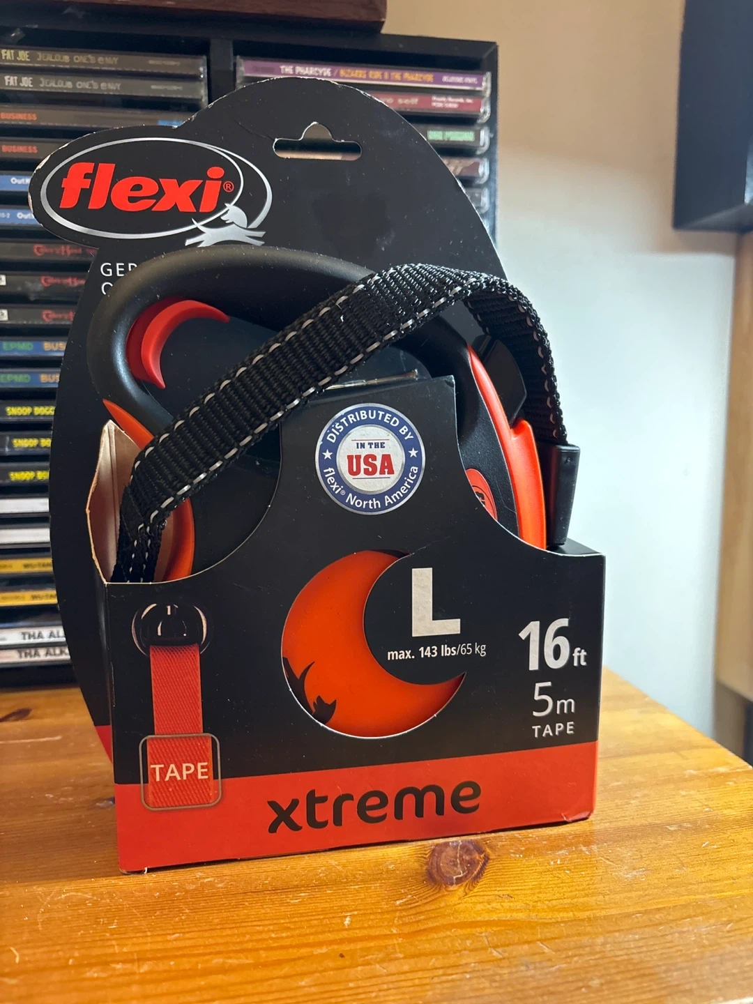 309Selling a brand new Flexi Xtreme retractable dog leash! It's size L, and extends to 16 feet (5m). It's designed for dogs up to 143 lbs (65 kg). Perfect for giving your pup some freedom on walks!