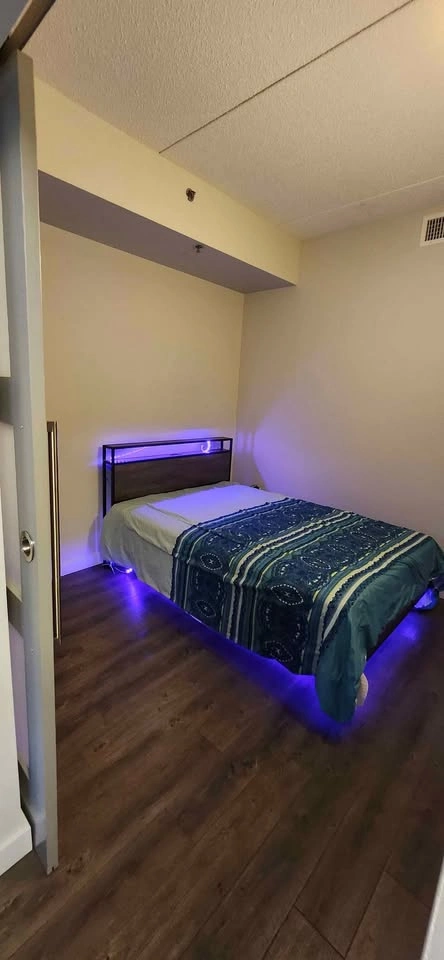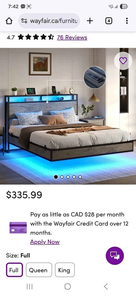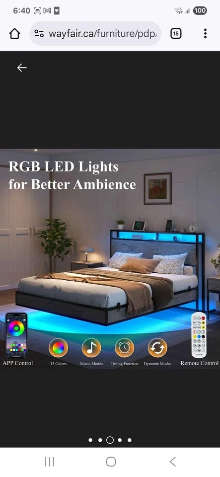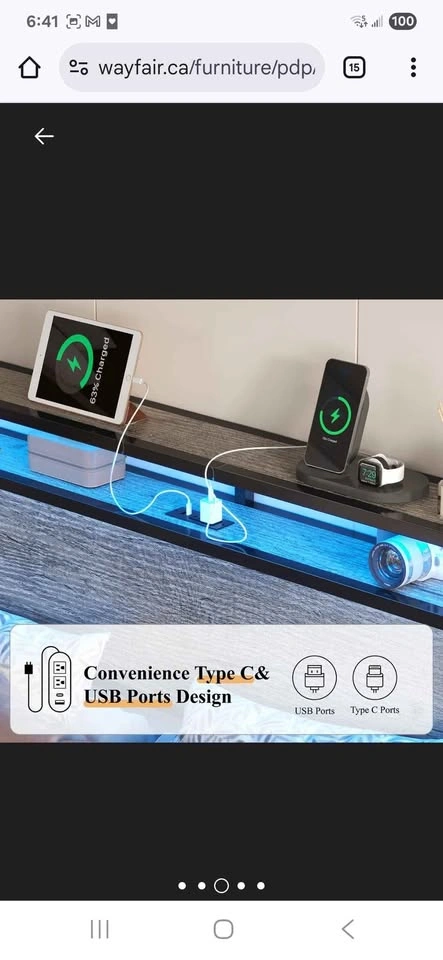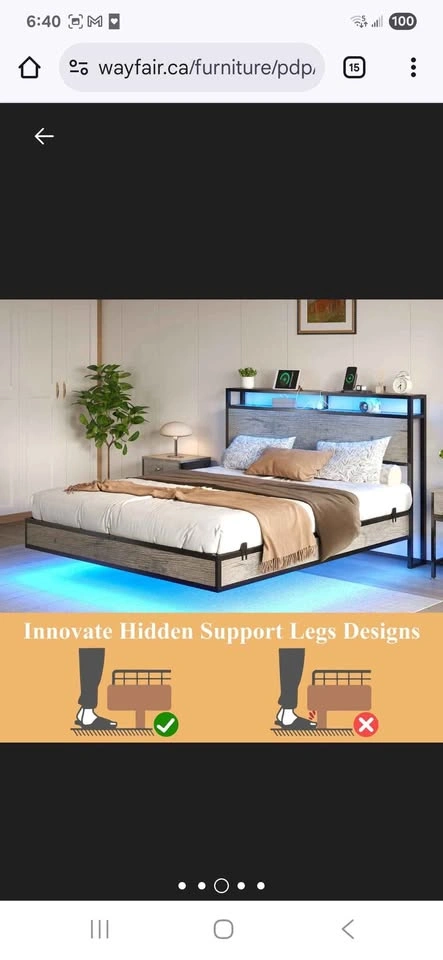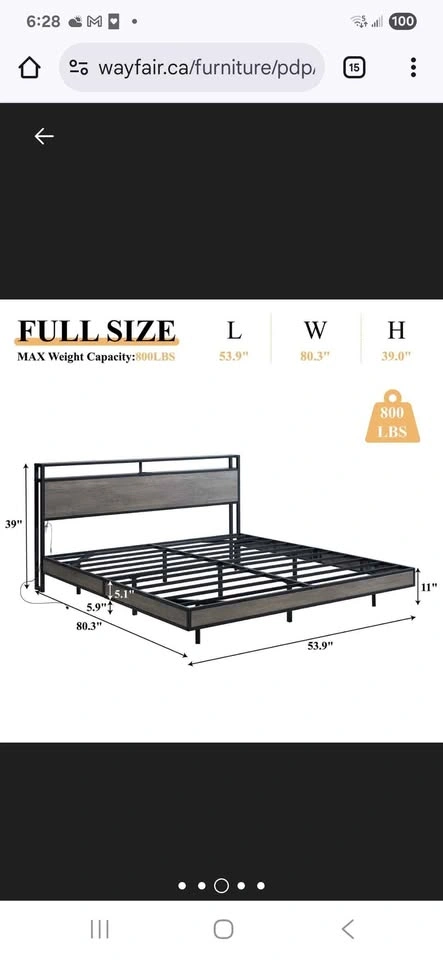Rustic Grey Full Size bed bought from Wayfair, used for a few days only by a guest. Bought for 388 including taxes. Selling for 250 OBO Metal slats. Headboard includes USB, Type-C, and AC outlets for convenient charging. 5.1" underbed clearance adds hidden storage and easy cleaning access. Let me know if you're interested!
