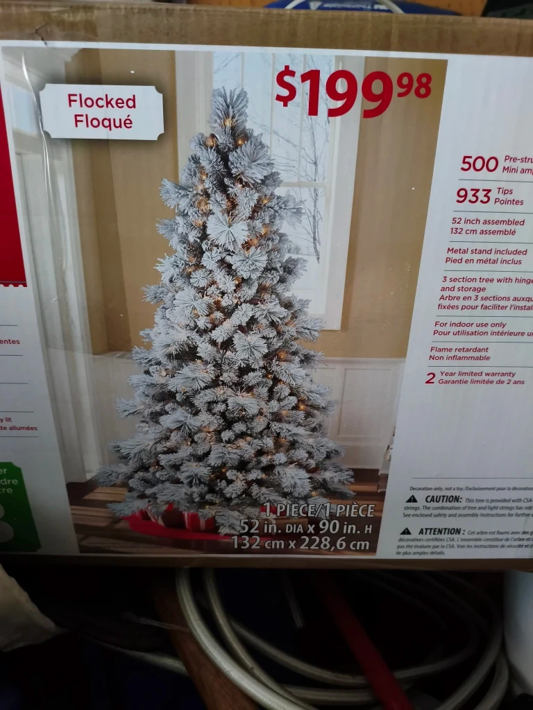 70Flocked Christmas tree that's 52 inches when assembled (132 cm). It comes with a metal stand and is a 3-section tree with hinges for easy storage. Perfect for indoor use and it's flame retardant!