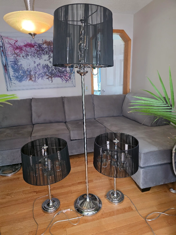 Selling a matching set of floor and table lamps. The set includes one floor lamp and two table lamps. They feature a sleek chrome finish with black sheer shades. These lamps will add a touch of elegance to any room